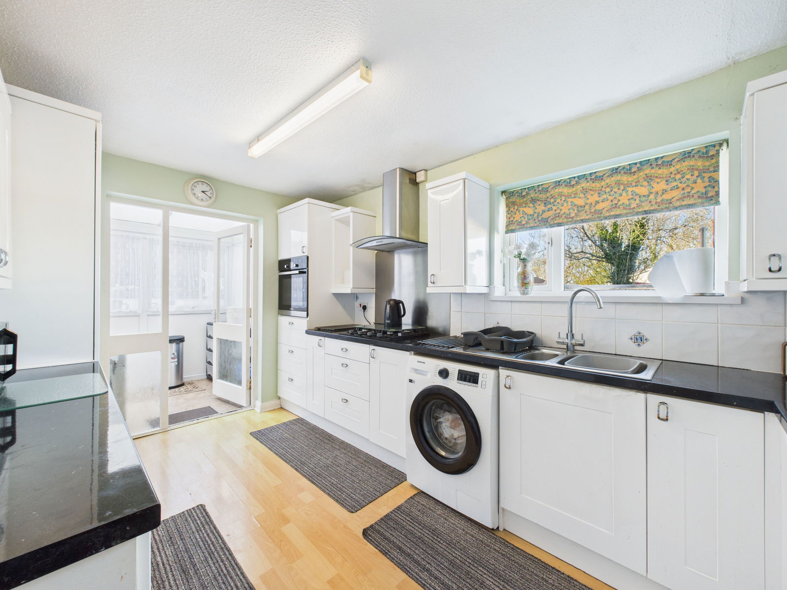 KITCHEN Range of base and wall kitchen units with integrated electric oven, four ring gas hob with stainless steel extractor over and stainless steel splashback, one and a half bowl sink inset to work surfaces, cupboards for storage housing gas boiler, PVCu double glazed window and power points. Glazed door to:-