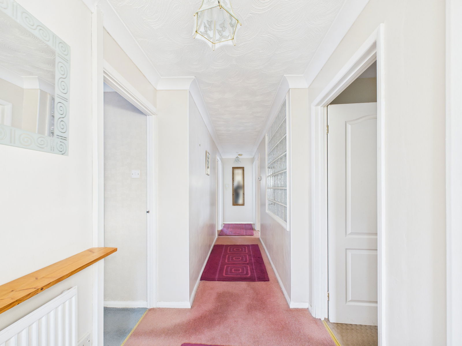 ENTRANCE HALLWAY Central heating radiator, power points, built-in storage cupboard with hanging and shelving space and doors to:-