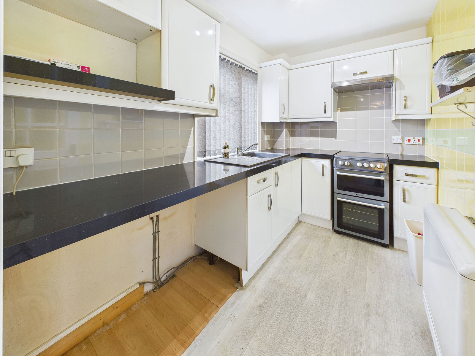 KITCHEN - 3m x 1.79m (9'10" x 5'10") A modern fitted kitchen boasting a range of overhead, base and drawer units with square edged work surfaces above. A 1 bowl composite sink and drainer unit, an electric cooker with induction hob and extractor hood above. Space and plumbing for a washing machine, fridge and microwave, complimentary tile backsplash and a uPVC double glazed window overlooking the communal gardens.