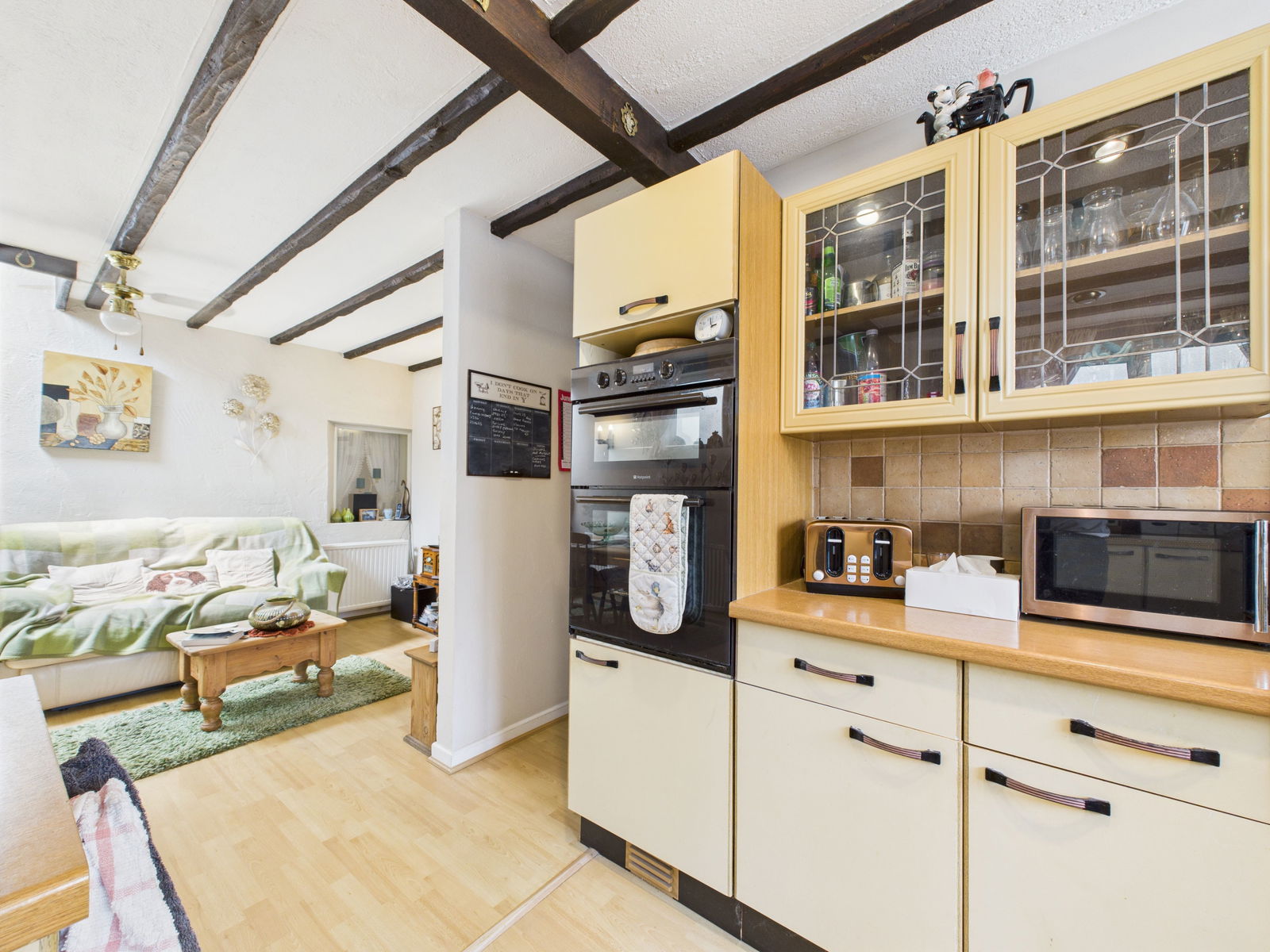 LOUNGE A charming lounge with a feature brick fireplace and exposed ceiling beams, creating a cosy cottage ambiance. A glazed internal window allows natural light to flow through from the kitchen/dining area. There is a large under stairs storage cupboard and a gas central heated radiator. French doors open through to the