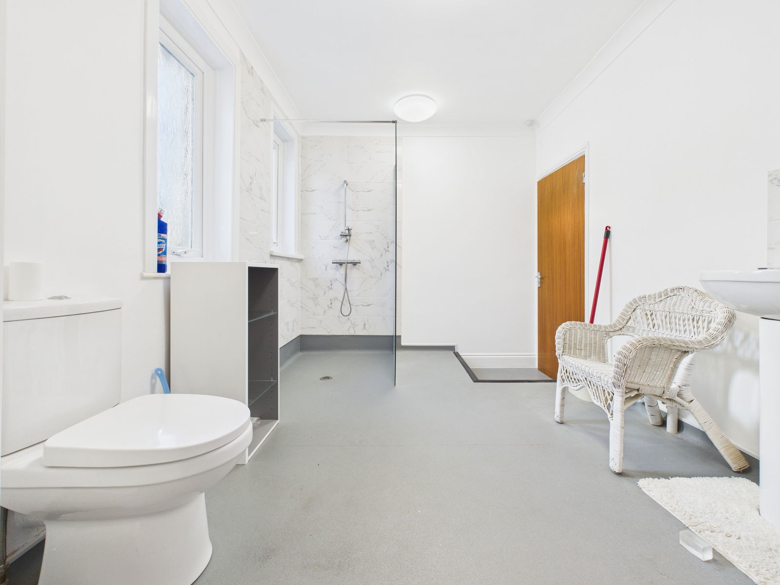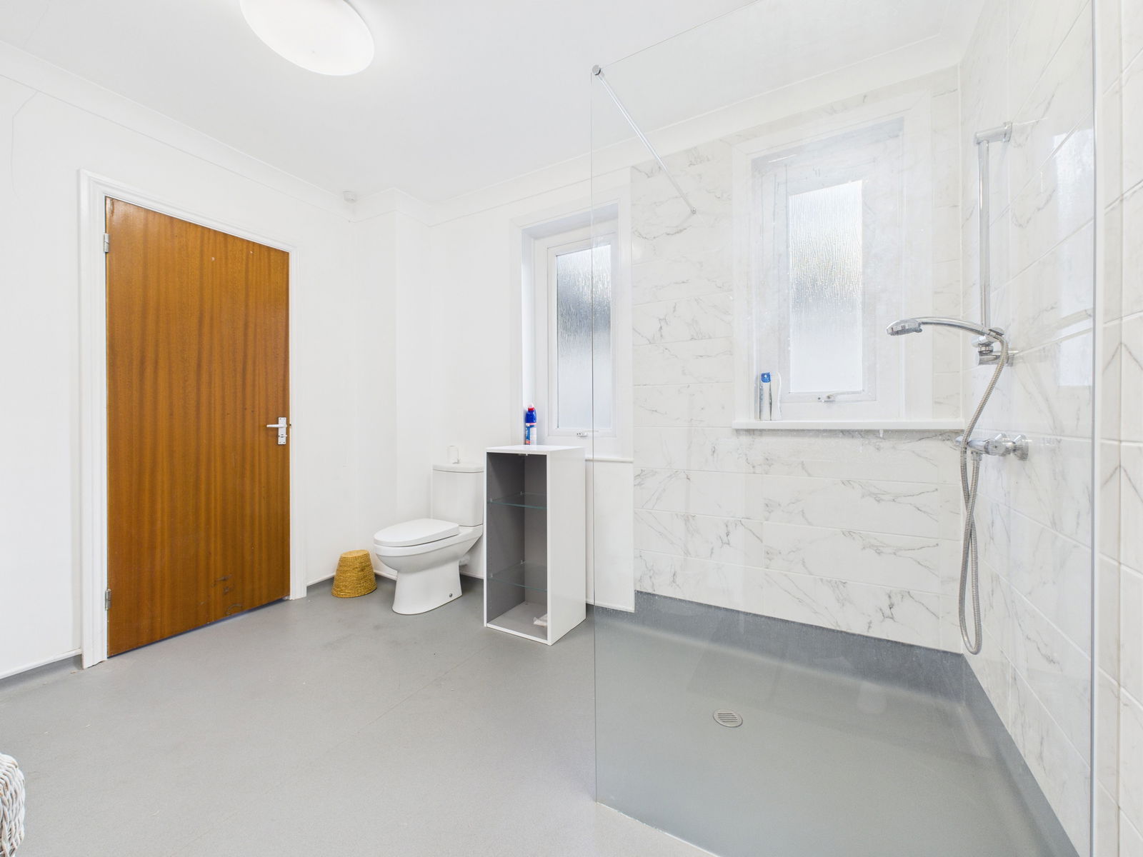 JACK AND JILL BATHROOM / EN-SUITE A modern and generously sized wet room accessible from both the master bedroom and hallway. The suite comprises a low level WC, pedestal wash hand basin and a walk in shower with glass screen and wall mounted fittings. Finished with complementary tiling, uPVC obscure double glazed windows and a white heated towel rail.