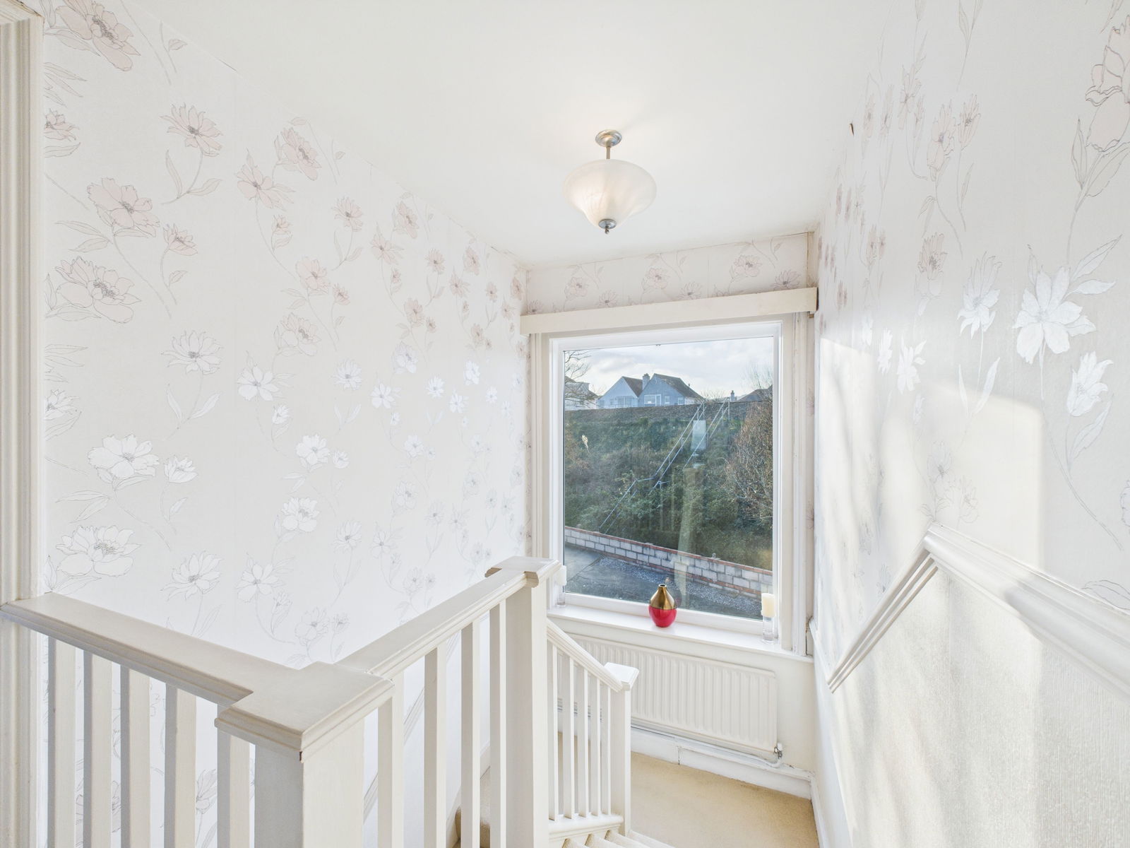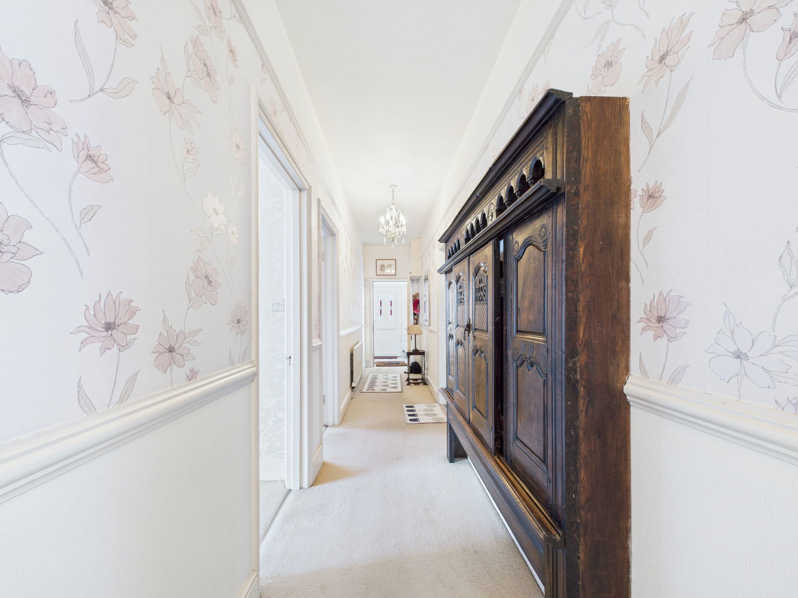 HALLWAY A welcoming inner hallway with doors leading to the adjoining rooms, stairs rising to the first floor, picture and dado rails, overhead lighting and two gas central heated radiators.