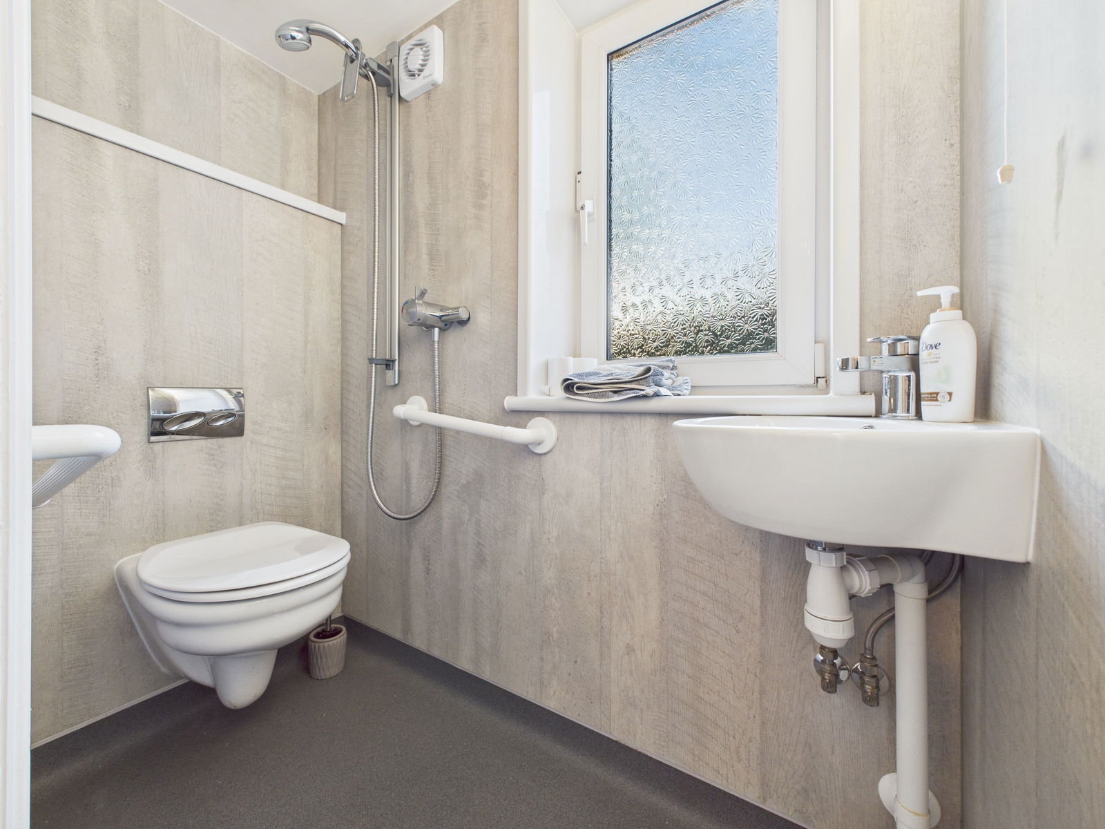 CLOAKROOM/WET ROOM A useful cloakroom/wet room with low level flush WC, a wall mounted wash hand basin and wall mounted shower attachments. uPVC obscure double glazed window and extractor fan.