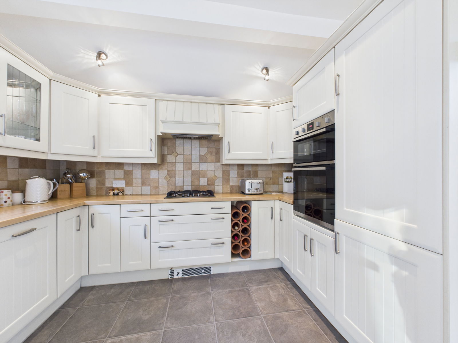 KITCHEN/DINER A large kitchen/diner perfect for modern day living and entertaining with a range of overhead, base and drawer units with roll edged work surfaces above. A 1 1/2 bowl composite sink and drainer unit, an eye level electric Neff double oven with grill integrated and a four ring gas hob with extractor hood above. Further integrated appliances include dishwasher, fridge and freezer, tile backsplash, double aspect double glazing with windows to the side aspect and French doors leading out to the gardens. Space for a 8 seater dining table, overhead spotlighting and a gas central heated radiator.