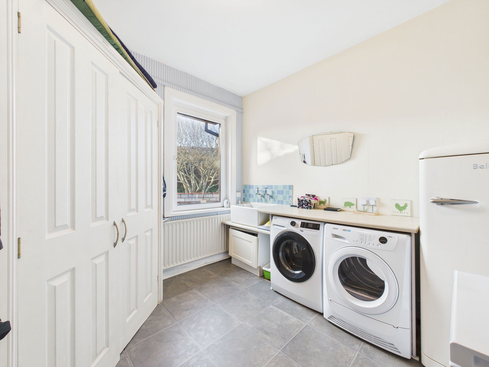 UTILITY ROOM A useful utility room with space and plumbing for a washing machine, dryer and further fridge freezer. A 1 bowl Belfast porcelain sink, a deep built in storage cupboard, a uPVC double glazed window and a gas central heated radiator.
