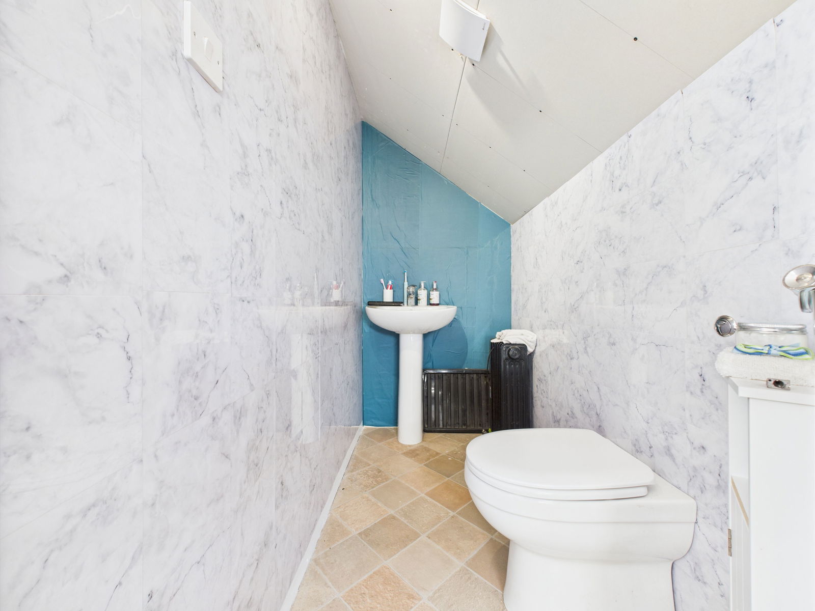 CLOAKROOM A low level flush WC and a pedestal wash hand basin.