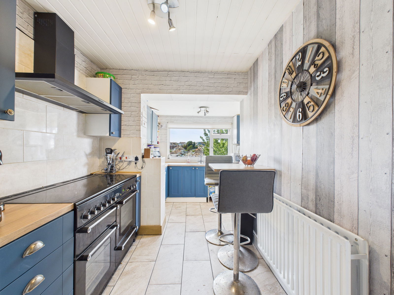 KITCHEN - 4.8m x 2.92m (15'8" x 9'6") A spacious kitchen/breakfast room boasting a range of overhead, base and drawer shaker style units with roll edged work surfaces above. A 1 1/2 bowl stainless steel sink and drainer unit, a range cooker with a five ring gas hob and hot plate with extractor hood above. Space and plumbing for a washing machine, dryer, dishwasher and American fridge freezer. Complimentary tile backlash, a uPVC double glazed door leading out to the rear gardens, a uPVC double glazed window, space for a breakfast bar table and a gas central heated radiator.