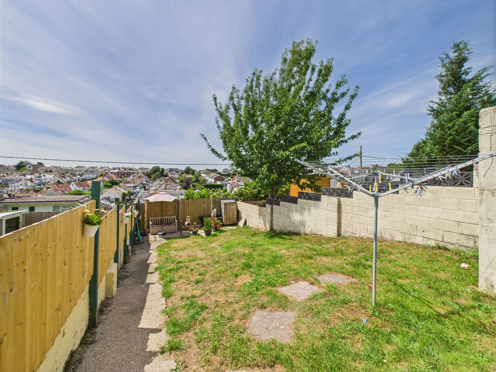 OUTSIDE A great sized, south facing and enclosed rear garden that has been designed for ease of maintenance and following the sun throughout the day. Within the gardens there is a raised patio area perfect for taking in the beautiful sea views across the bay, steps then lead down to a further lawned section and a side gate leading out to the front of the property.