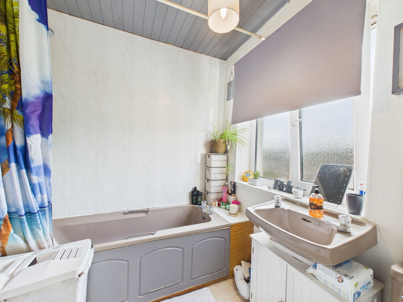 BATHROOM A three piece suite comprising of a low level flush WC, a pedestal wash hand basin and a panelled bath unit with shower attachments above. PVC panelled walls, a uPVC obscure double glazed window and a heated towel rail.