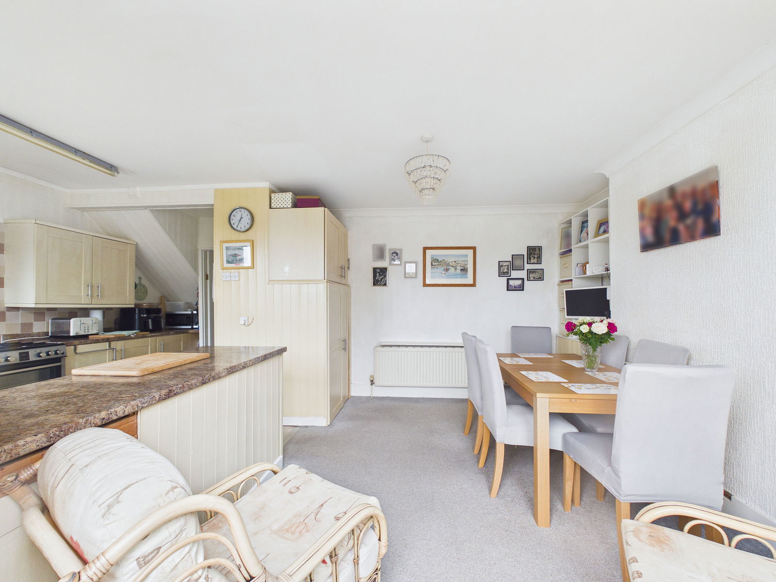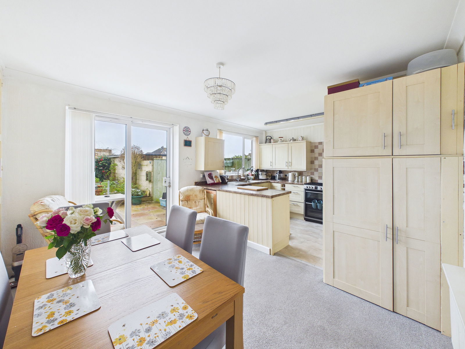 KITCHEN/DINER Range of fitted wall and base units, plus appliance space, breakfast bar subdividing the dining area. uPVC double glazed window and patio doors. Central heating radiator.