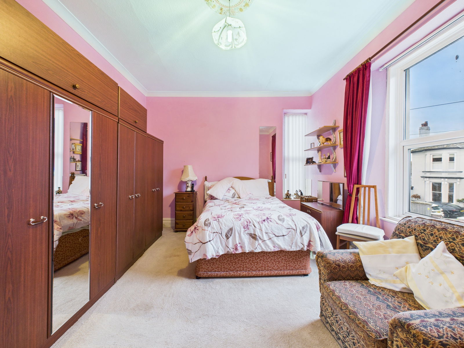 BEDROOM ONE A substantial master bedroom located at the front of the property, featuring high ceilings, an elegant ceiling rose, a uPVC double glazed window overlooking the front garden and a gas central heating radiator.