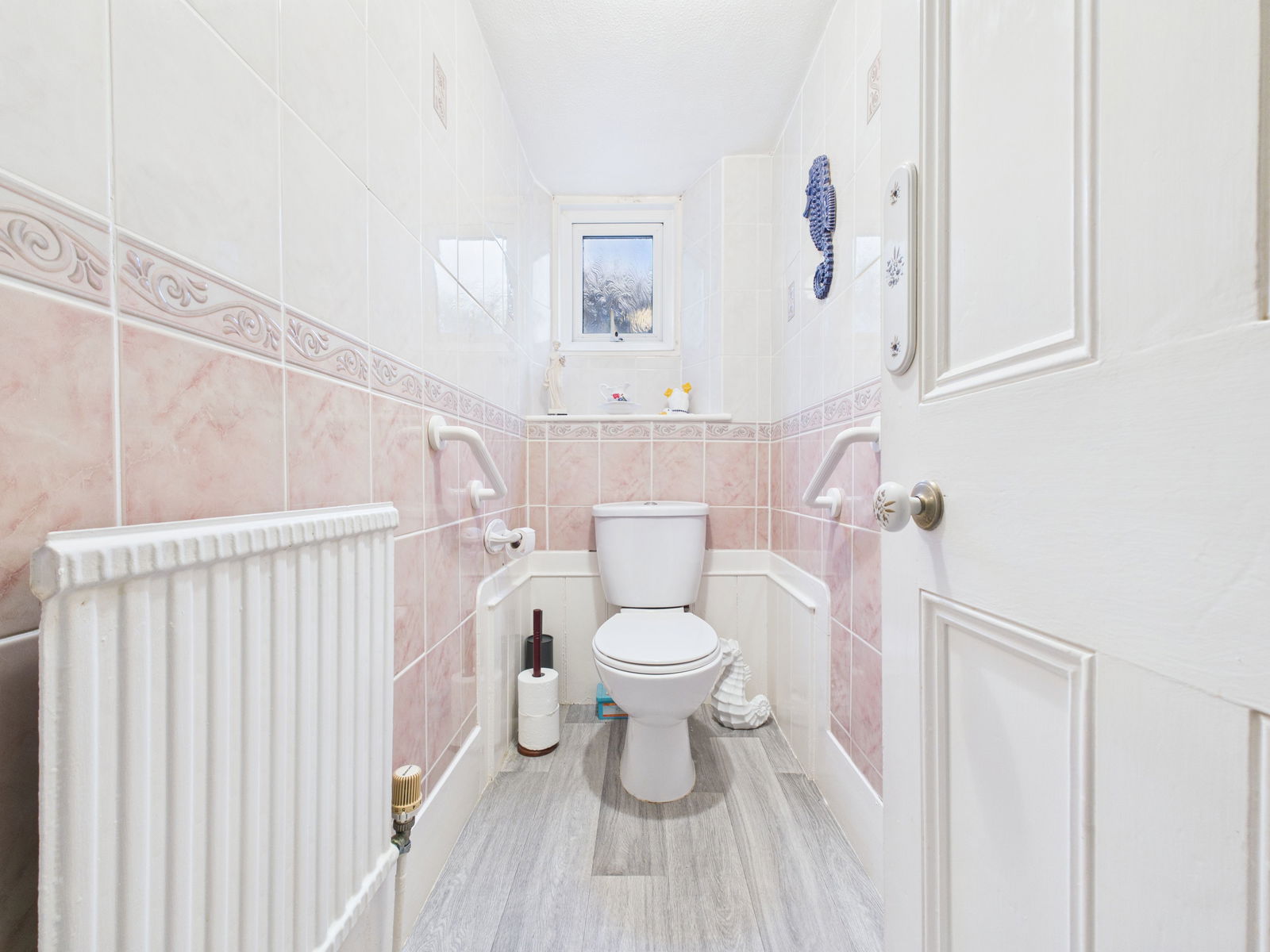 CLOAKROOM A practical cloakroom comprising a low level flush WC, tiled walls, a uPVC obscure double glazed window and a gas central heating radiator.