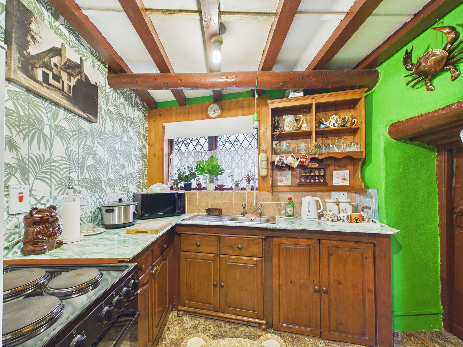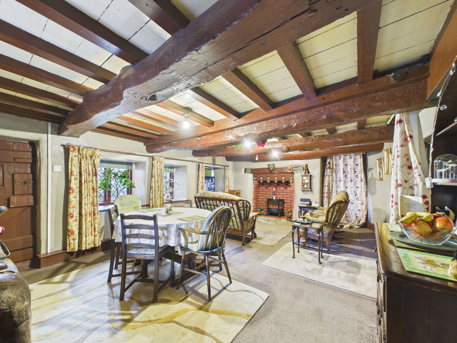 LOUNGE / DINING ROOM A wonderfully spacious lounge and dining area, perfectly suited to both relaxing and entertaining. The room is rich in period charm with wooden ceiling beams and double aspect windows. Additional features include TV, internet and telephone points, along with a sliding door leading to a useful storage area. An electric heater, while an original door leads through to the kitchen.