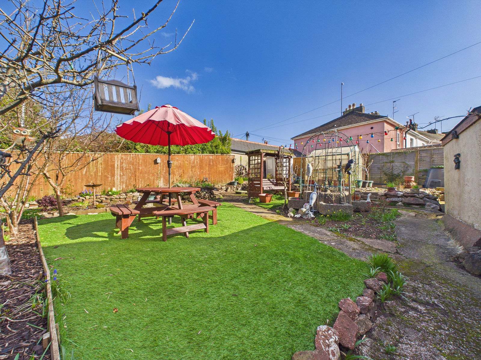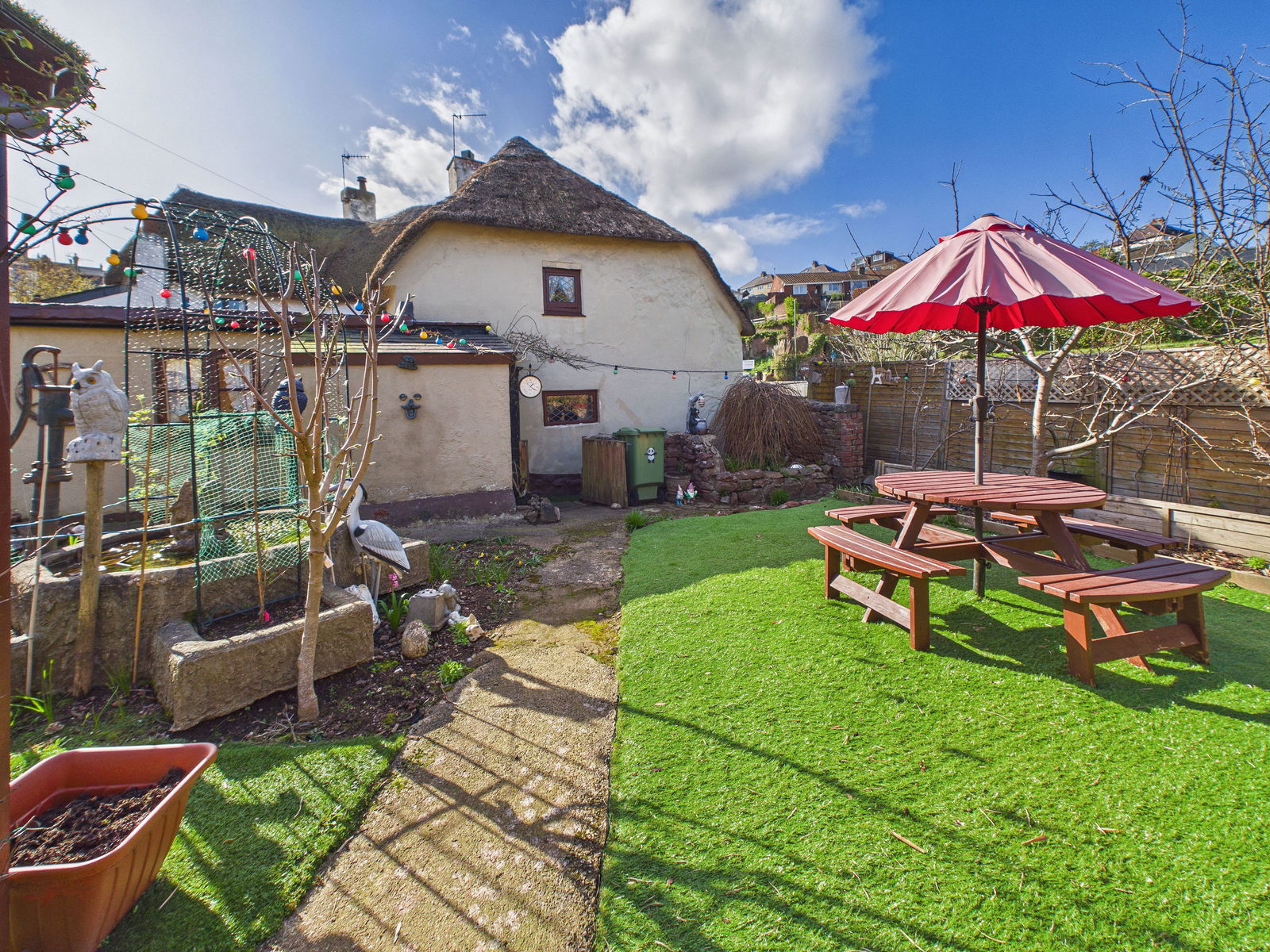OUTSIDE The property enjoys a beautifully established, sun drenched English cottage garden, offering a peaceful and private outdoor setting. A patio seating area provides the perfect spot for alfresco dining and relaxation, while an artificial lawned section ensures easy maintenance. The garden is richly planted with a variety of mature plants, shrubs and an impressive selection of fruit trees, including apple, pear, plum, apricot and cherry, creating a delightful and productive garden. A charming fish pond further enhances the atmosphere.