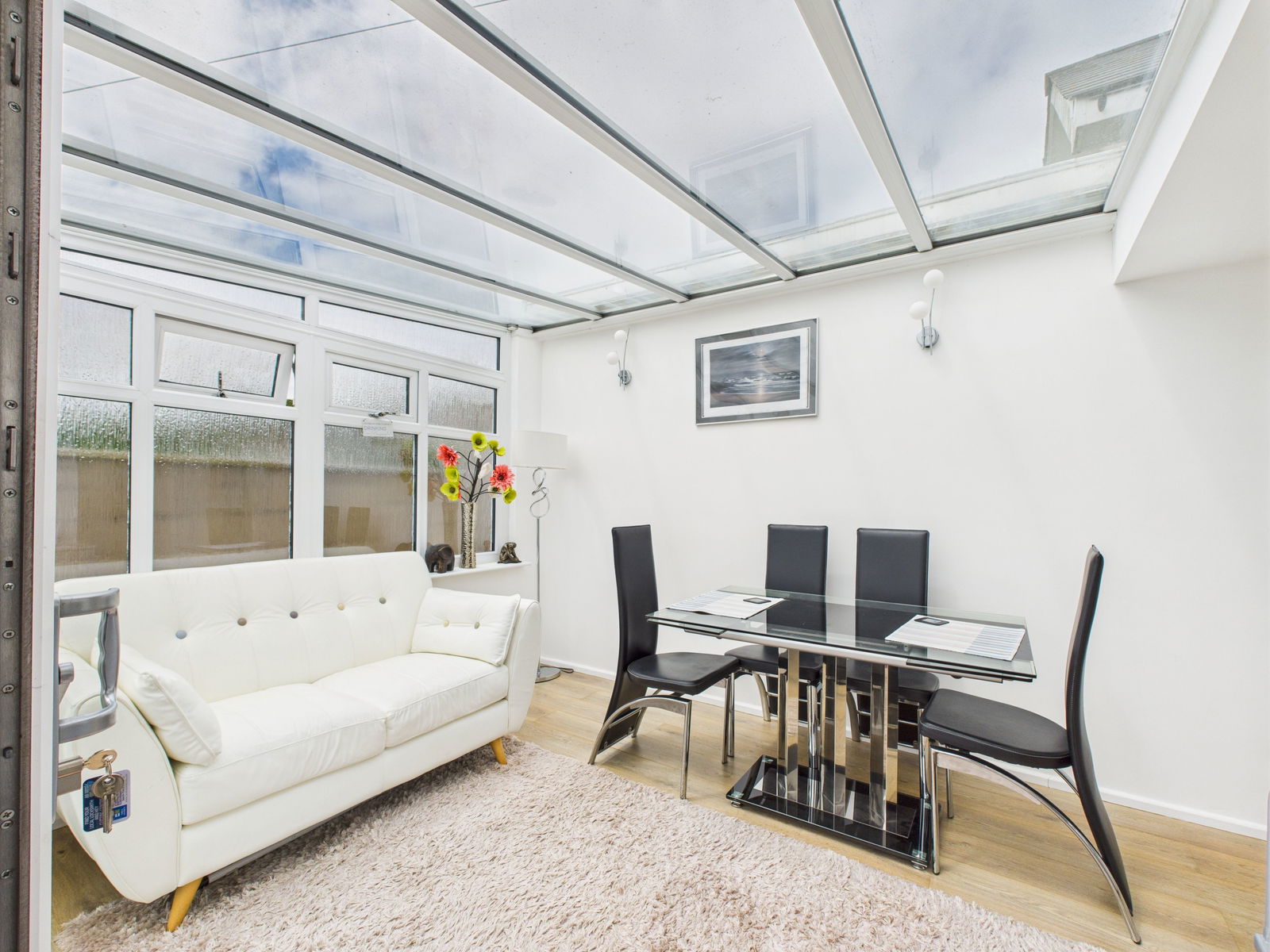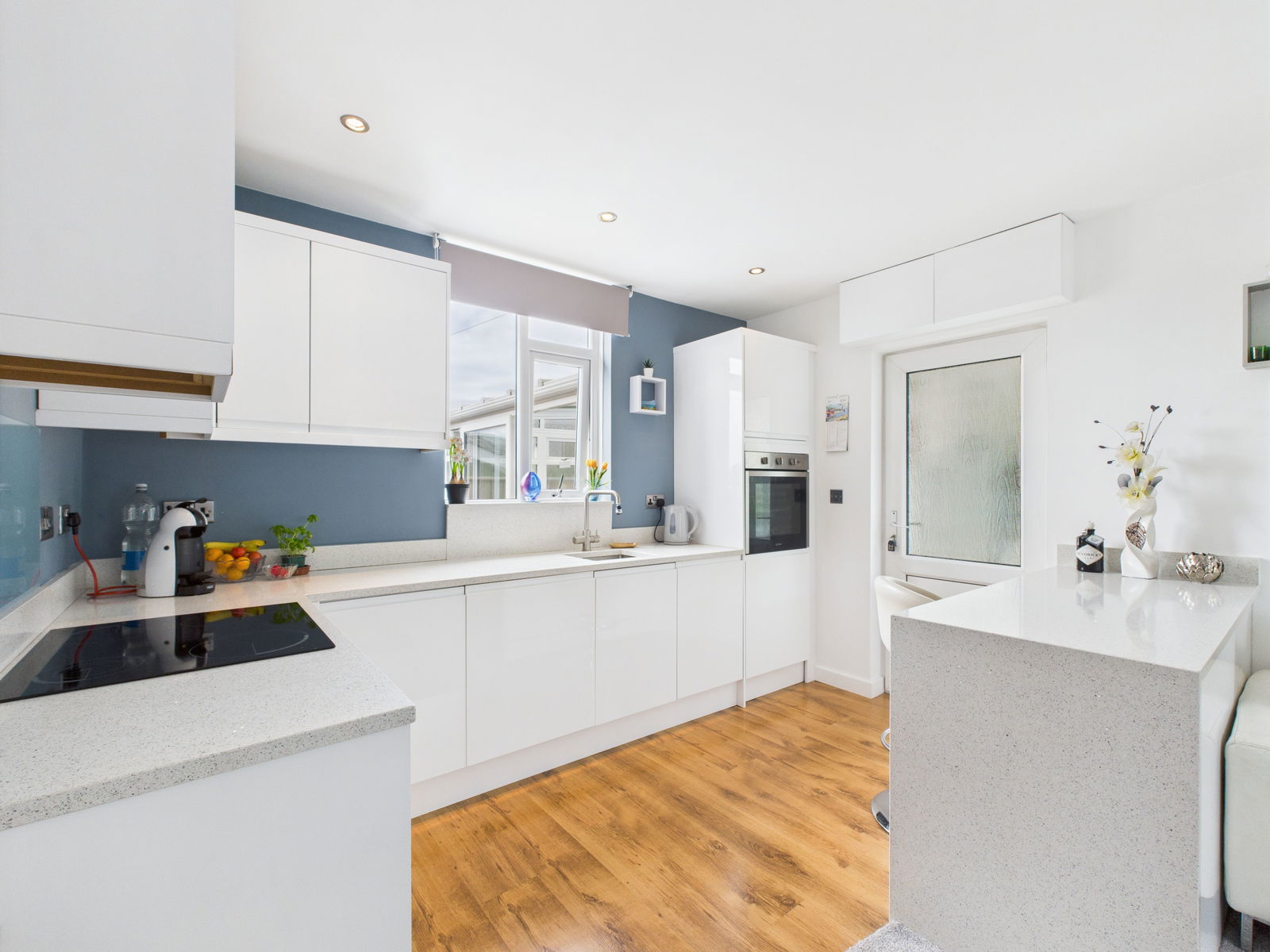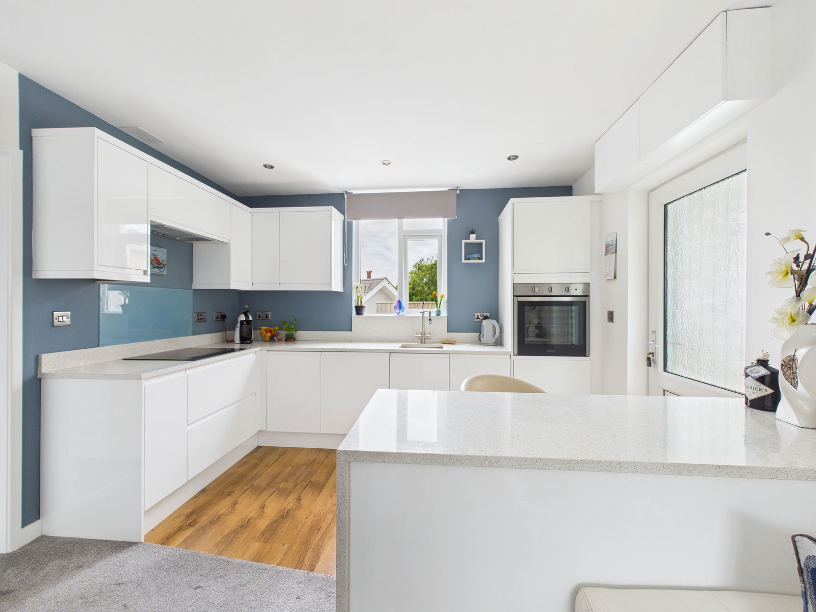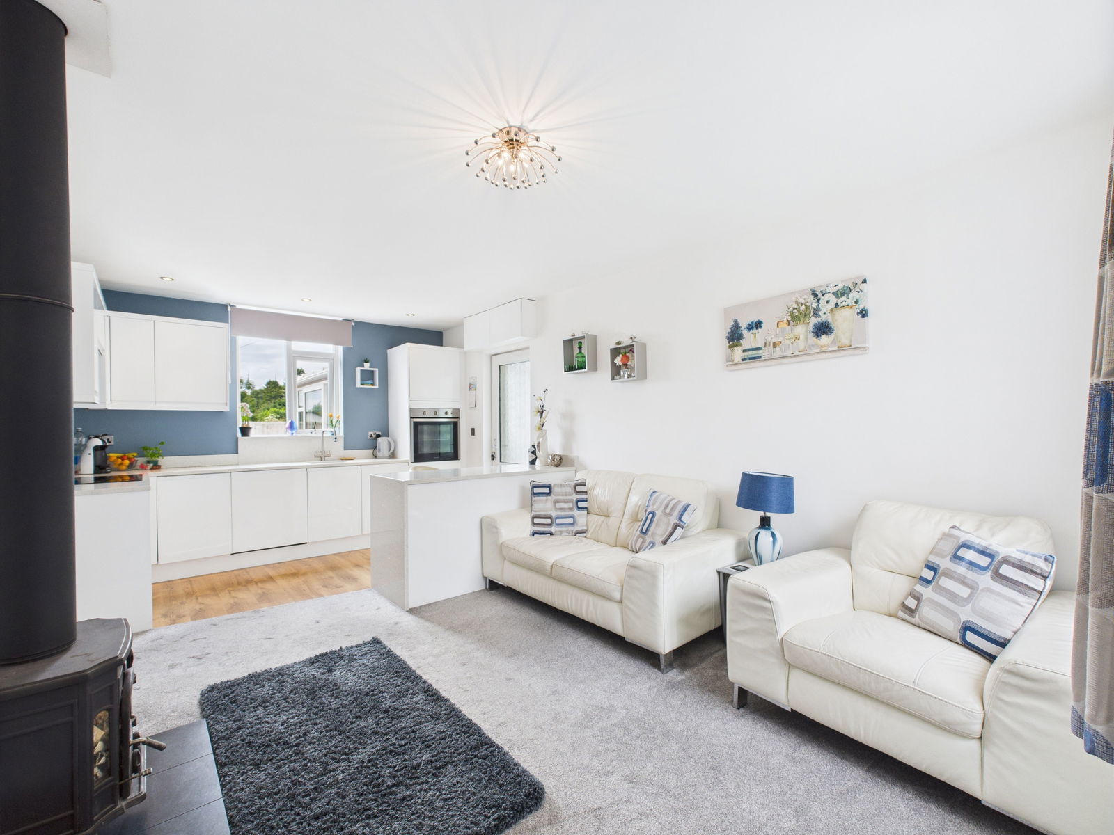 This stunning open plan kitchen and living area is the heart of the home, designed for modern living and entertaining. The contemporary kitchen features sleek high gloss wall, base, and drawer units topped with luxurious quartz work surfaces. It comes fully equipped with an integrated electric single oven and grill, a four ring hob with extractor fan and a built in dishwasher.