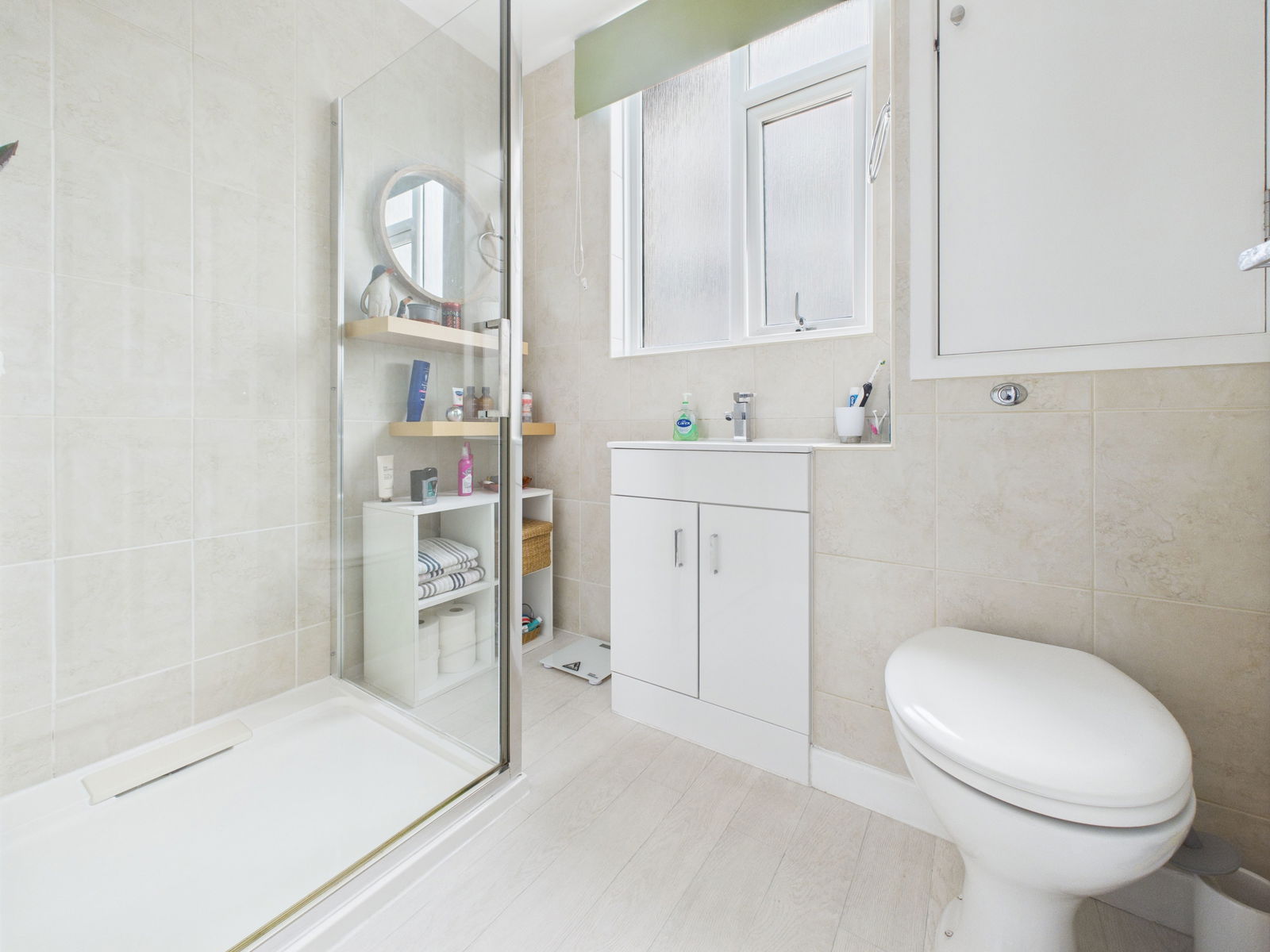 A modern and stylish family shower room comprising a low level WC, a vanity unit with integrated wash basin and storage and a spacious walk in double shower. Finished with tasteful complementary tiling, built in storage cupboard and a uPVC obscured double glazed window.
