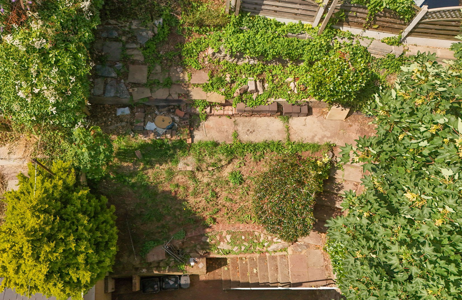 A two tier level rear garden with a concrete patio area and steps leading to an upper patio section.