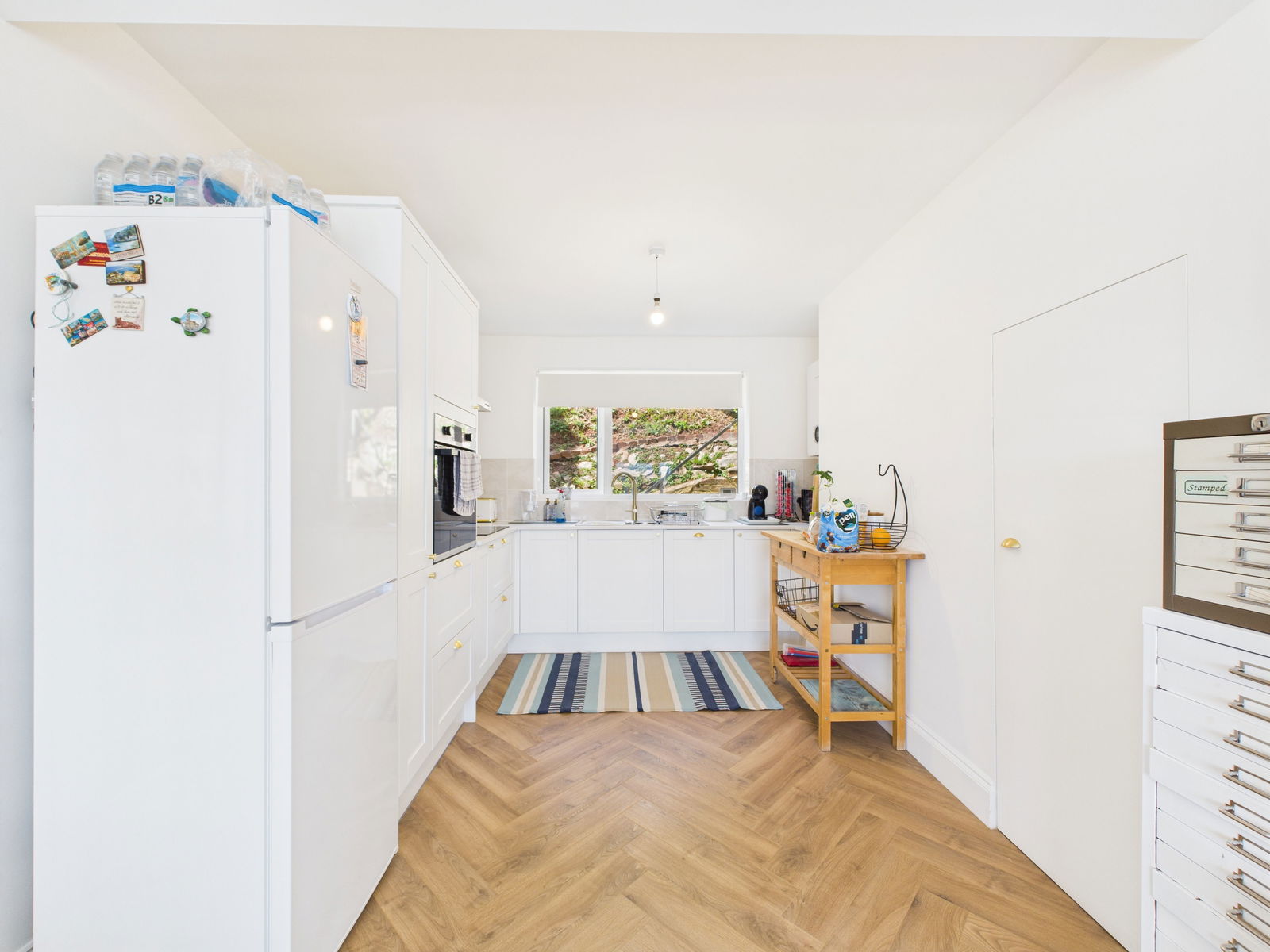 A beautifully presented, light filled open plan lounge and kitchen ideal for modern living. The kitchen is fitted with a stylish range of shaker style wall, base and drawer units complemented by square edged worktops and a tiled splashback. A 1½ bowl stainless steel sink with drainer, eye level integrated electric oven with grill, four ring induction hob with extractor hood and an integrated dishwasher are all provided. There is also space for a freestanding fridge freezer and a wall mounted Worcester combination boiler.
