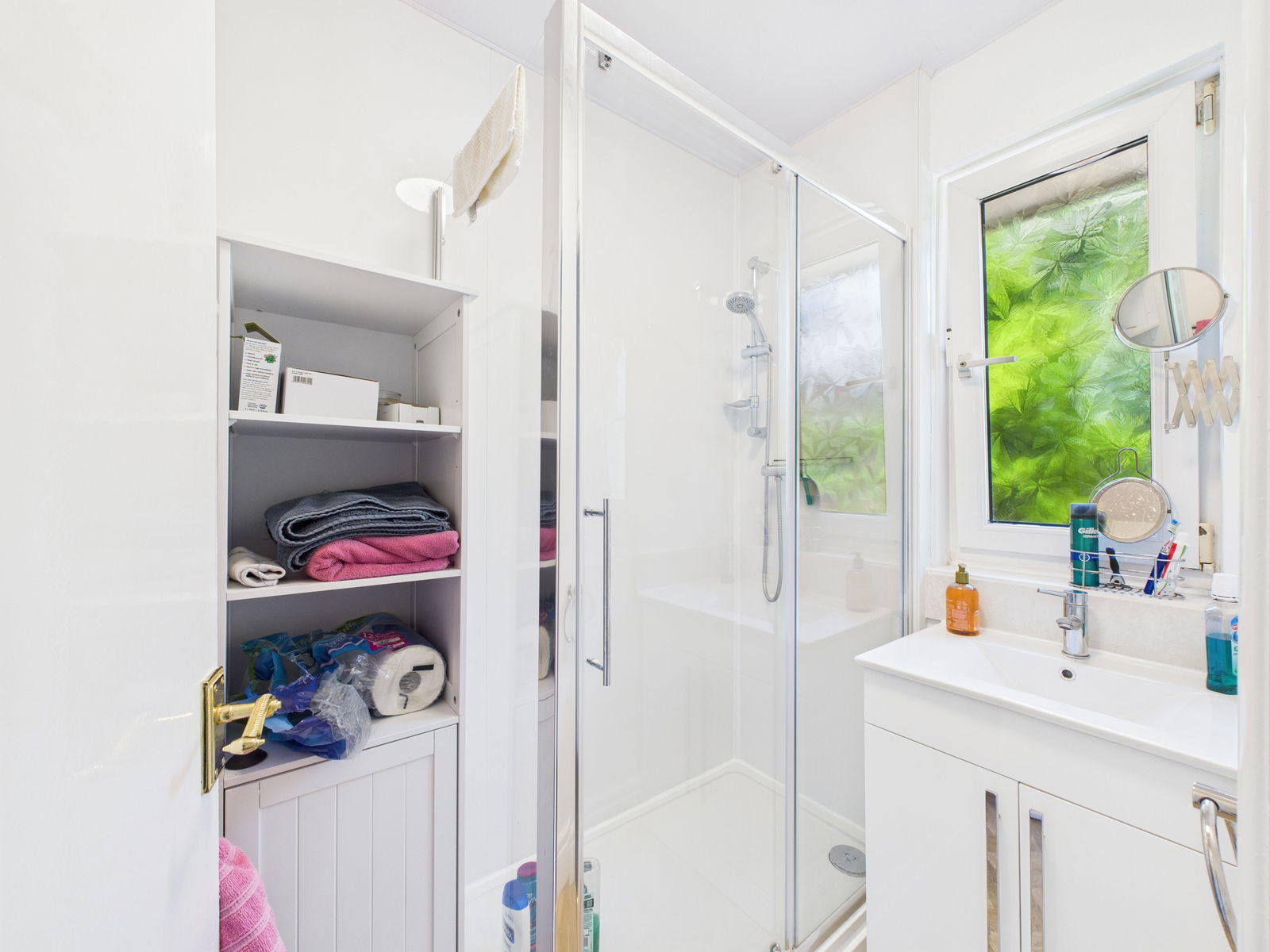 A contemporary shower room comprising a walk in double shower unit with complimentary panelled walls, vanity wash hand basin with storage below, chrome heated towel rail and a uPVC obscure double glazed window.