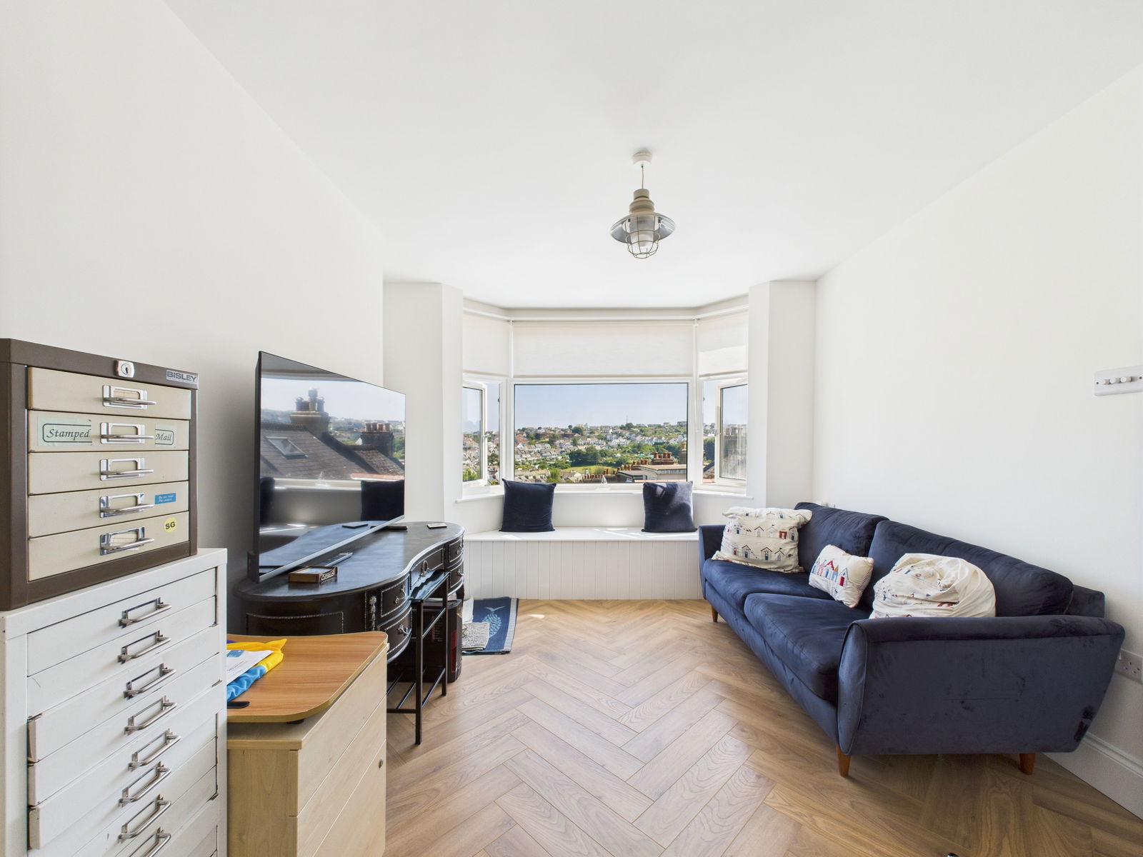 The lounge area offers ample space for furnishings, with a fitted storage cupboard and built in bay window seat, a gas central heated radiator, and a uPVC double glazed bay window that frames breathtaking sea views across the bay.