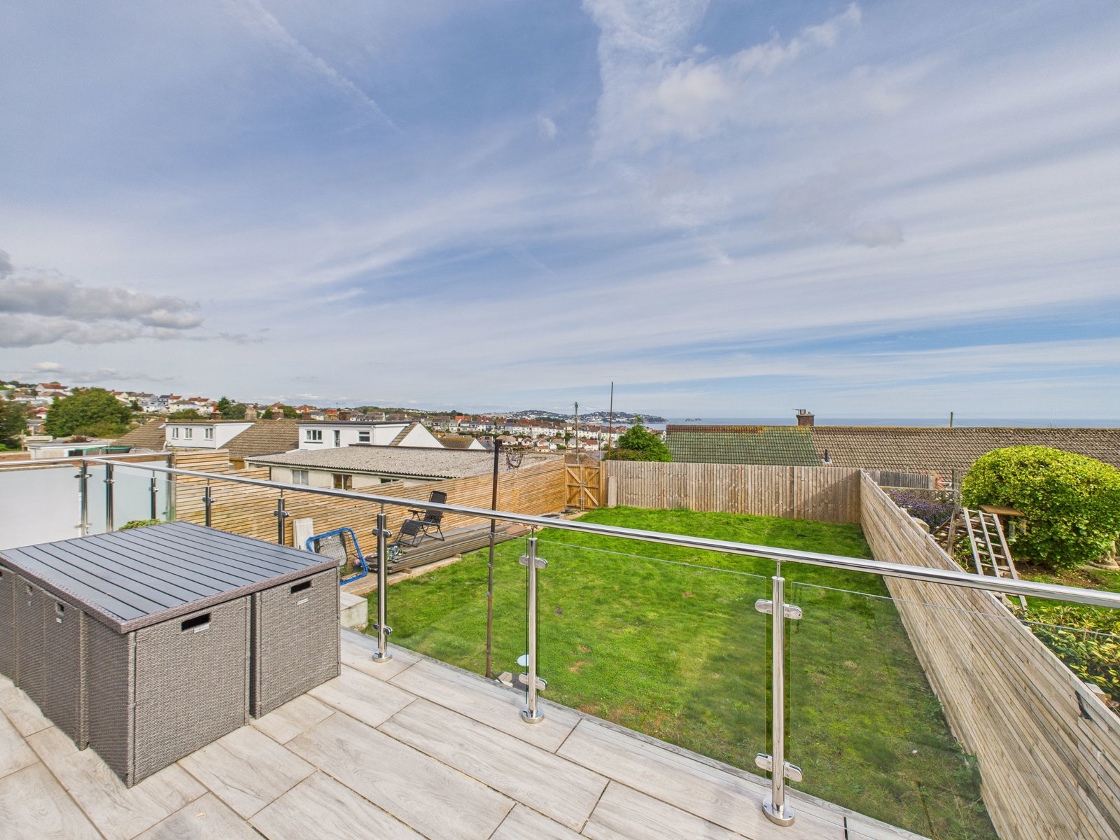 DECKING AND GARDEN To the rear, the property boasts a large decked terrace with glass balustrades, perfectly positioned to enjoy the stunning sea views. A few steps lead down to a level, fully turfed garden—ideal for children, pets, or outdoor entertaining.