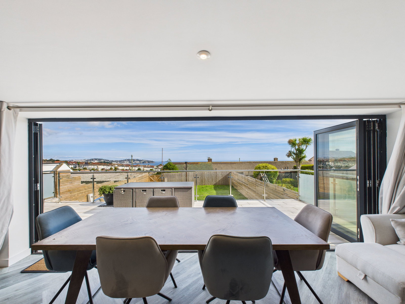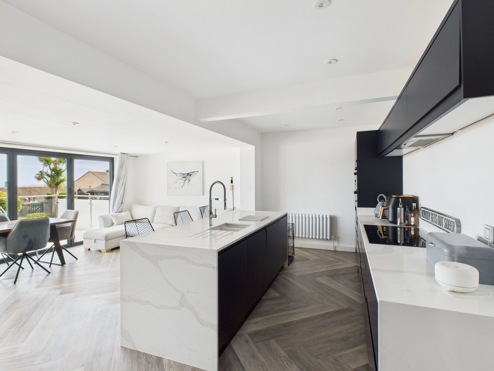KITCHEN This expansive open-plan area is a standout feature of the home. The kitchen includes a massive central island, breakfast bar, integrated dishwasher, built-in microwave, double electric oven, electric hob with extractor, and extensive storage and prep space. The bifold doors open out to panoramic sea views, flooding the space with natural light and connecting seamlessly to the outdoor decking. A superb layout for cooking, dining, and socialising.