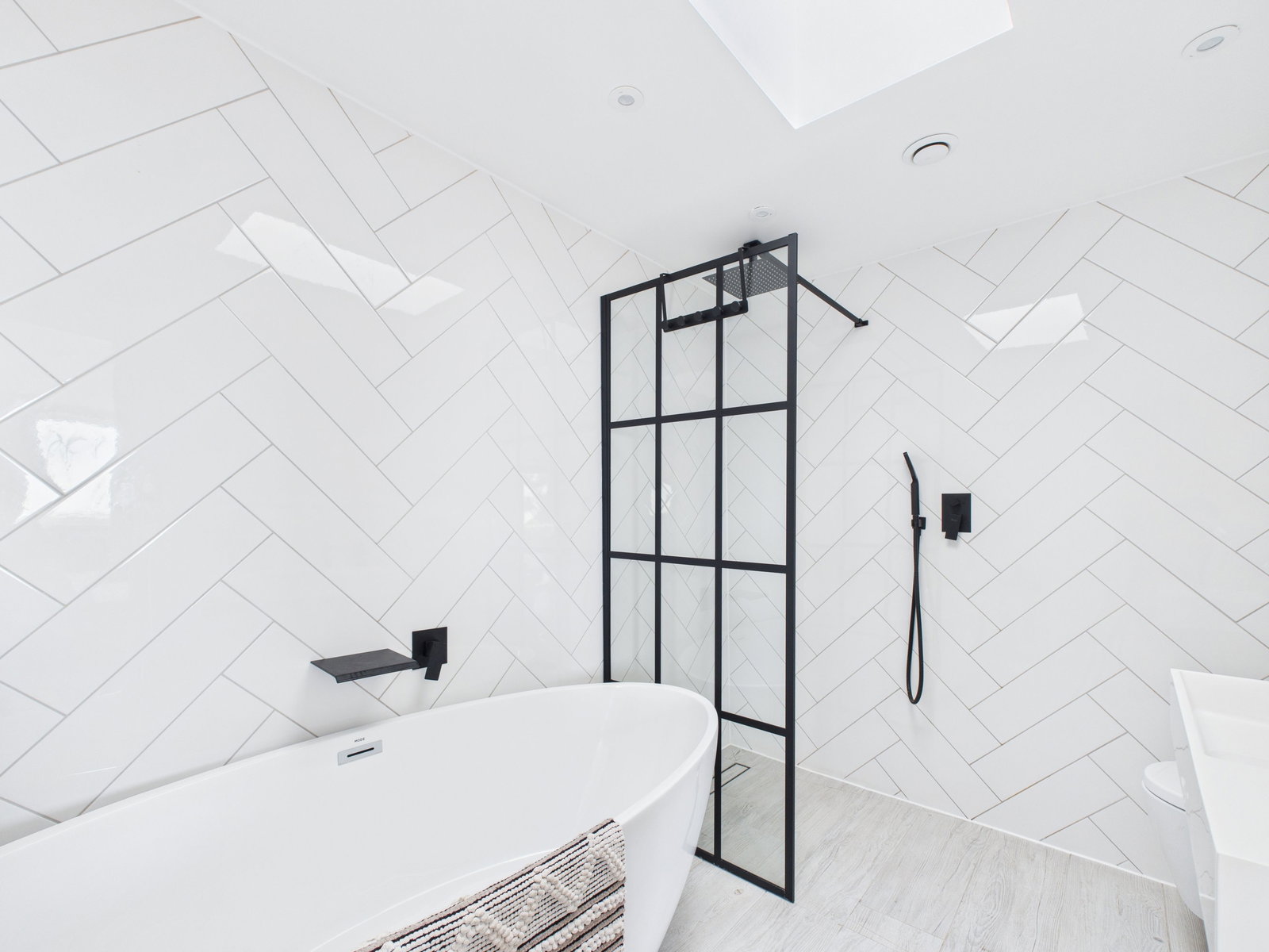 WET ROOM A fully tiled, high-spec wet room with a 4-piece suite, including a walk-in shower, large bath with waterfall tap, vanity unit, toilet, heated towel rail, and skylight for natural light and ventilation.