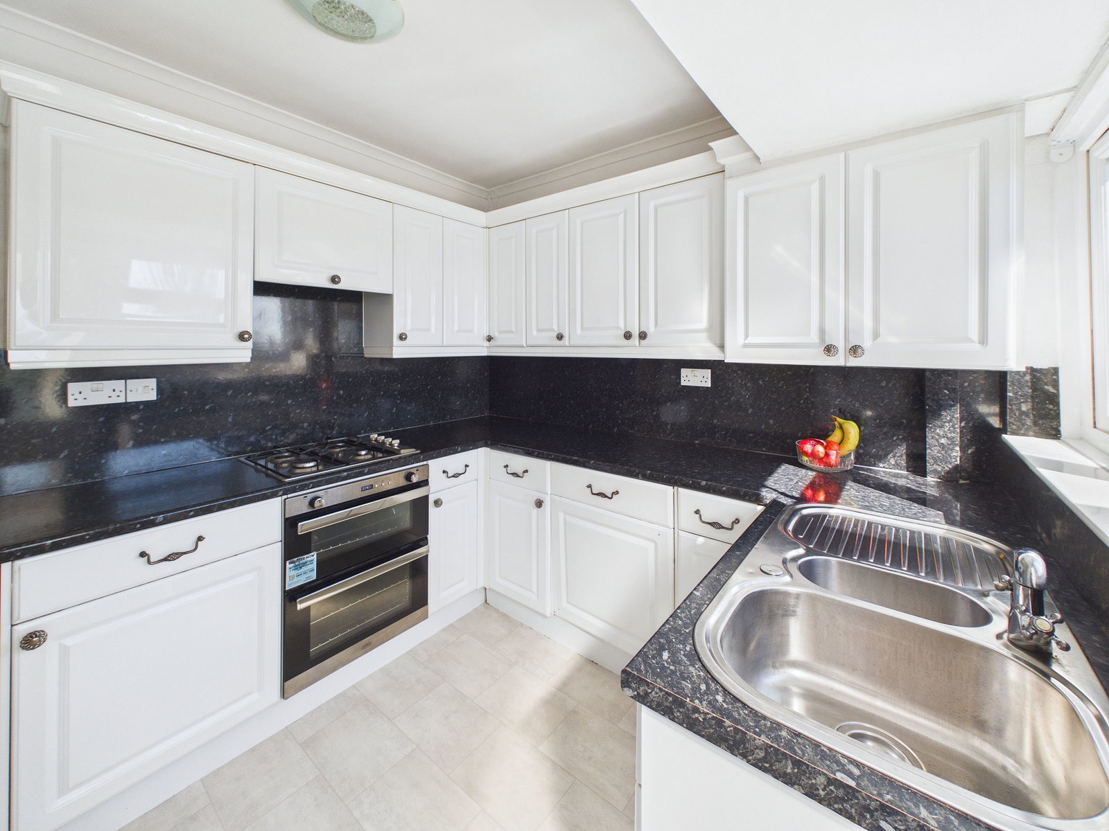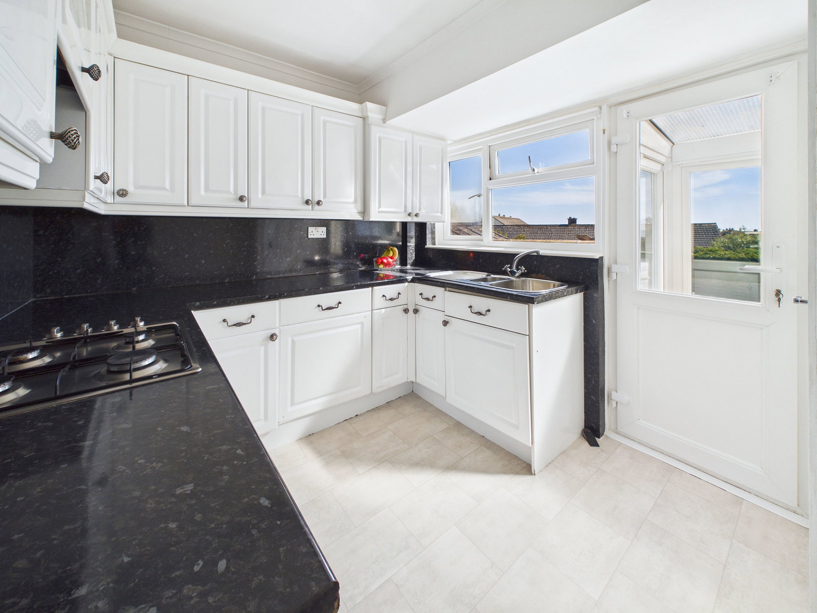 KITCHEN A well appointed fitted kitchen offering a range of wall, base, and drawer units with roll edged work surfaces over. There is a 1.5 bowl stainless steel sink and drainer, alongside integrated appliances including an electric double oven with grill, a four ring gas hob with extractor hood above, fridge, and washing machine. A cupboard houses the boiler. uPVC double glazed windows provide stunning sea views across to Berry Head, Brixham. A door leads through to the conservatory, and a gas central heating radiator.
