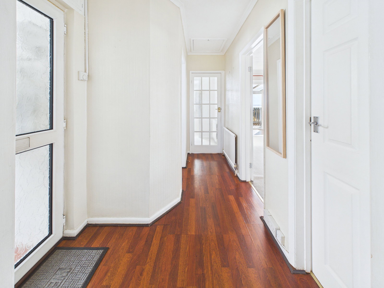 HALLWAY A bright and inviting hallway providing access to all principal rooms, featuring a loft hatch, ceiling lighting and a gas central heating radiator.