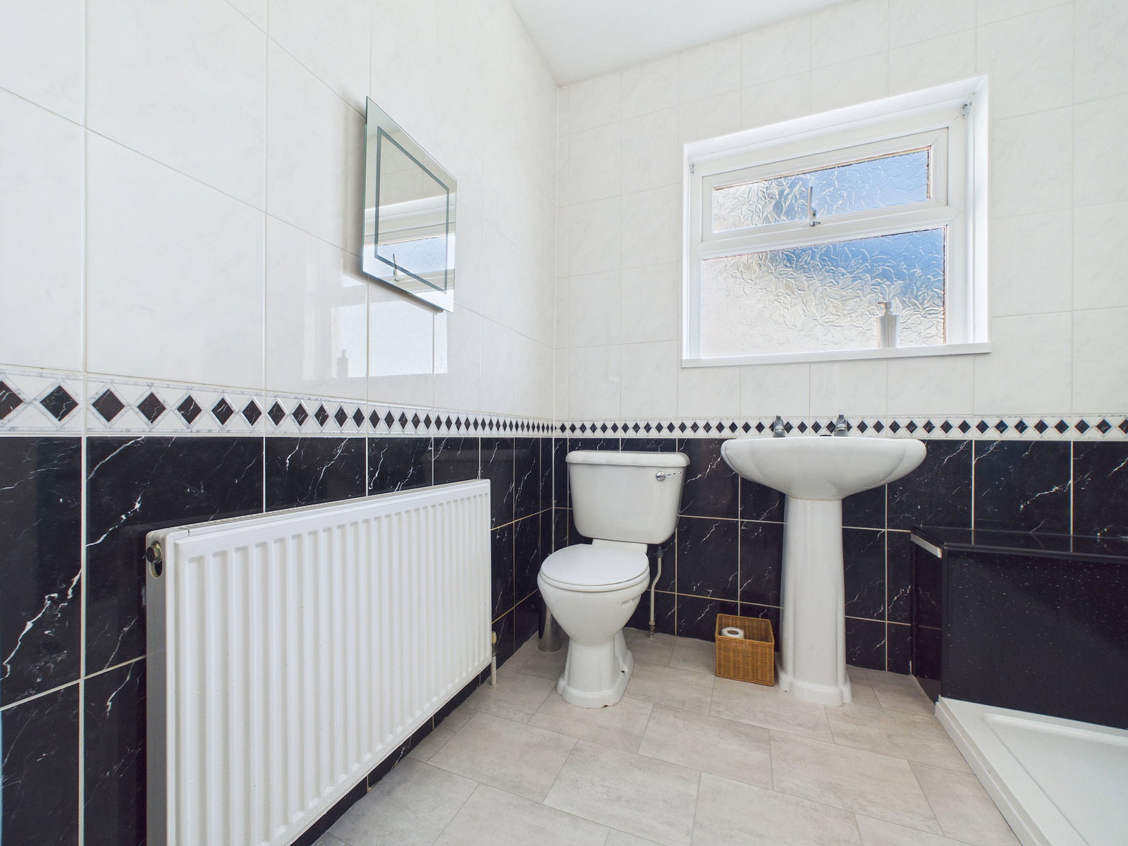 SHOWER ROOM A well proportioned shower room comprising a low level WC, pedestal wash hand basin, and a walk in double shower. Tiled walls, uPVC obscure double glazed window, and a gas central heating radiator.