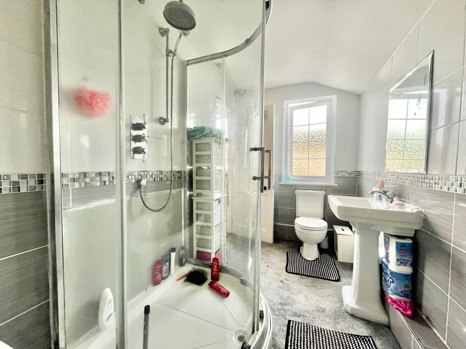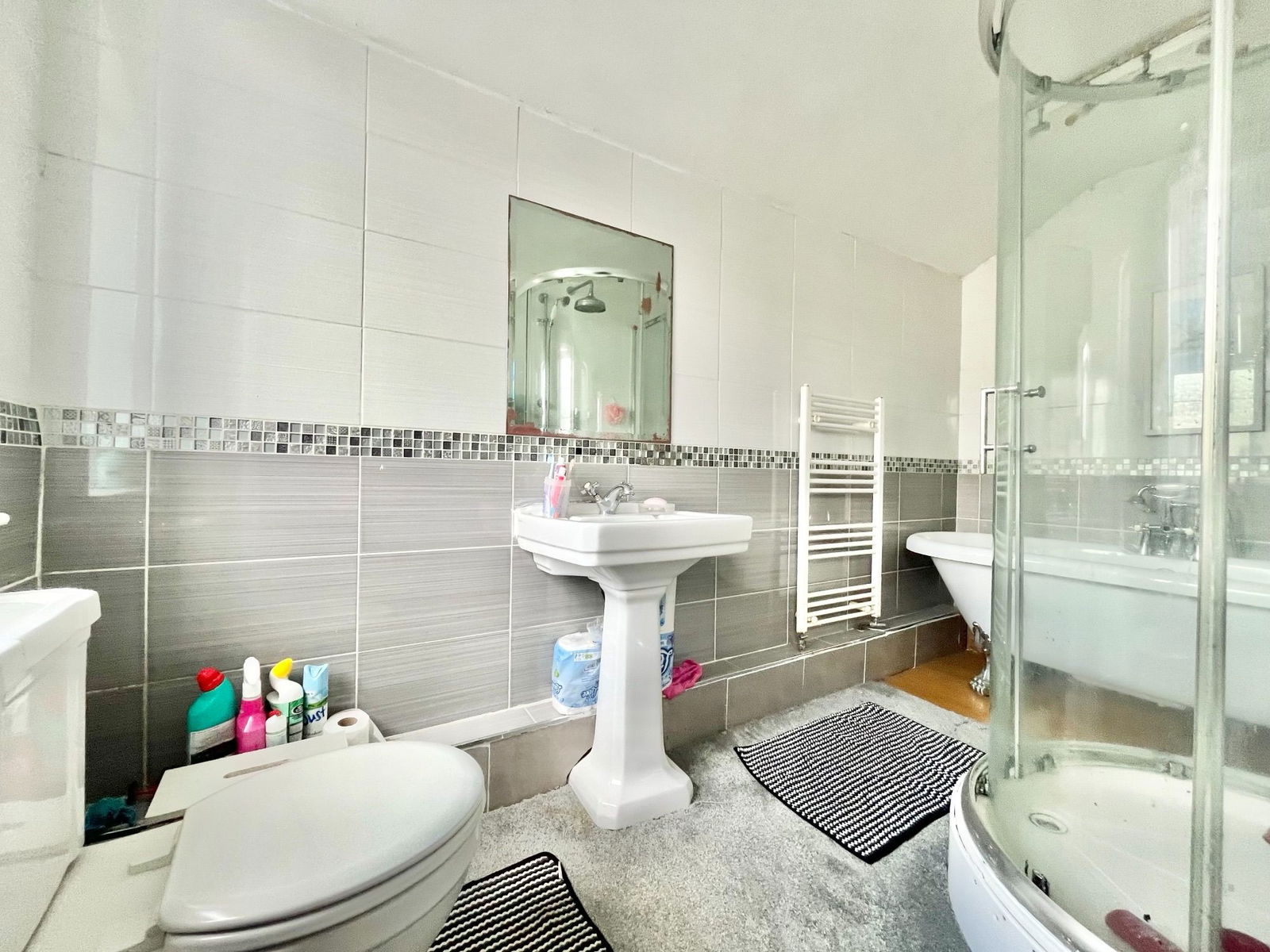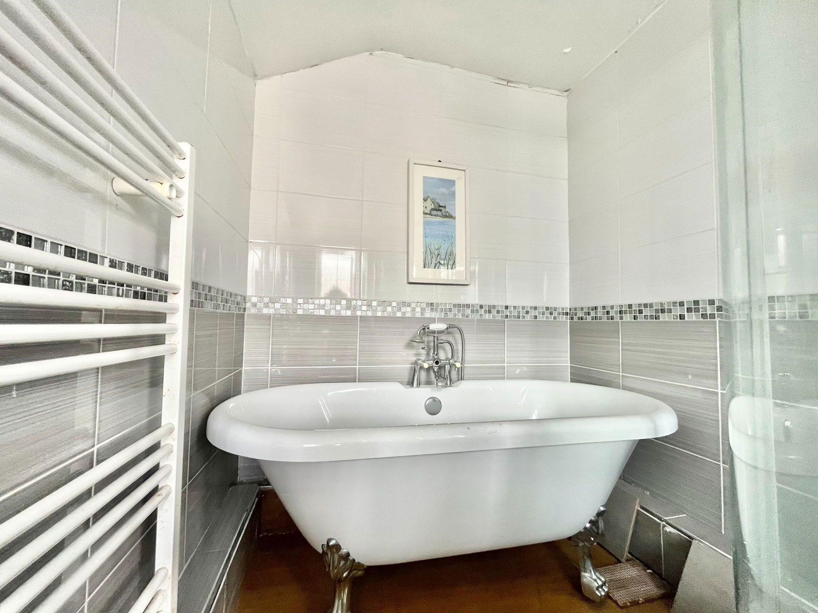 BATHROOM A wonderfully spacious family bathroom comprising a four piece suite of a low level flush WC, a pedestal wash hand basin, a claw foot freestanding bath tub and a double shower unit. Complimentary tiled walls, a uPVC obscure double glazed window and a white heated towel rail.
