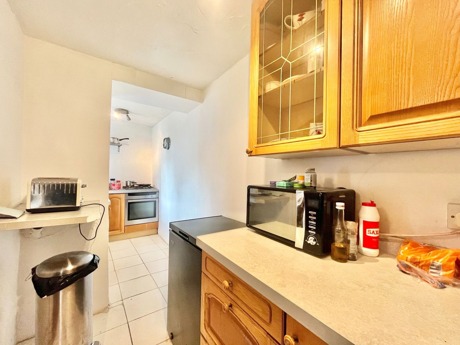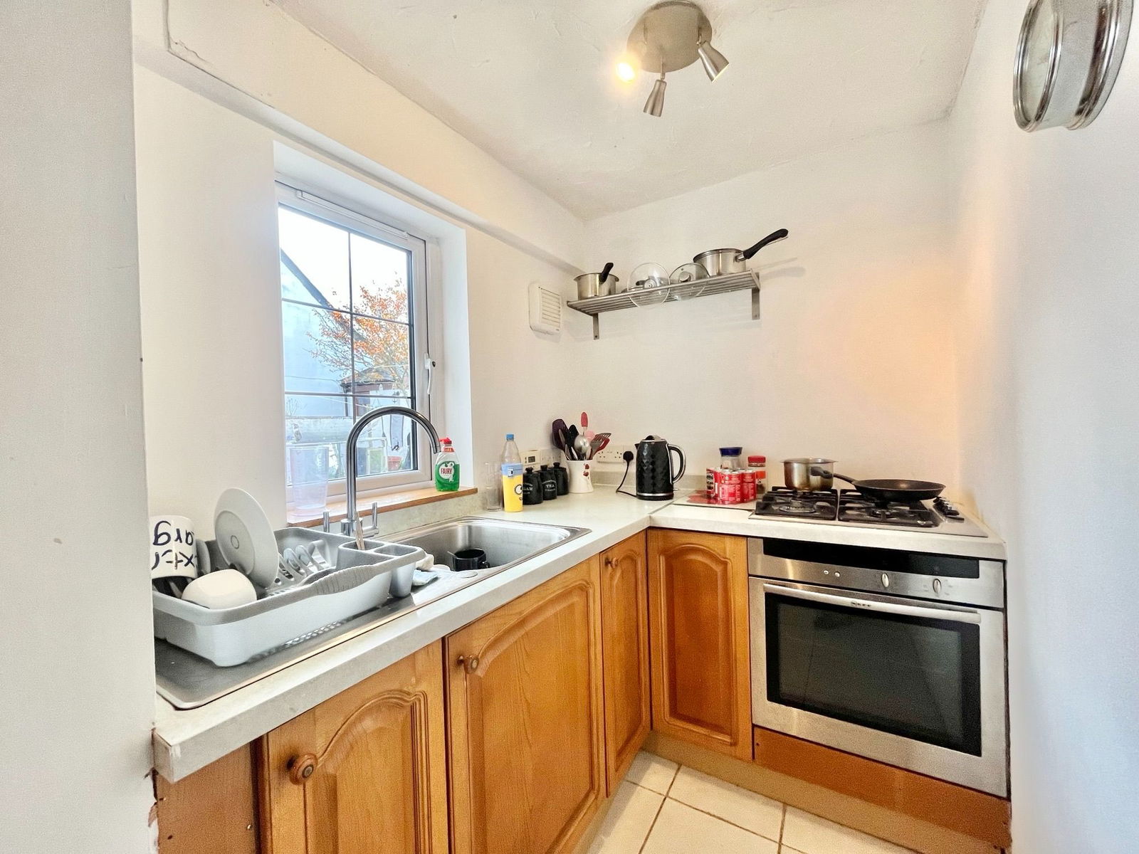 KITCHEN - 5.74m x 1.49m (18'9" x 4'10") A range of overhead, base and drawer units with square edged work surfaces above. A 1 bowl stainless steel sink and drainer unit, an electric single oven with grill integrated and a four ring gas hob, space and plumbing for an under counter appliance and fridge freezer and a uPVC double glazed window.