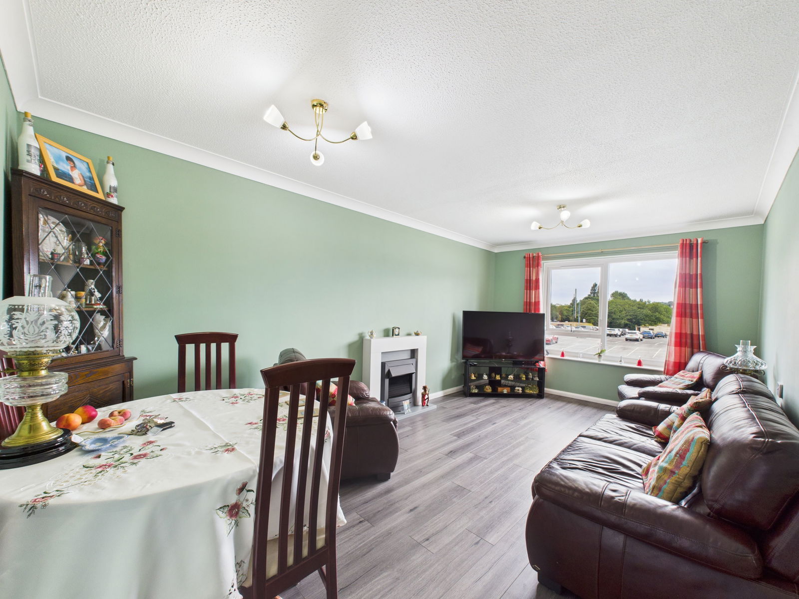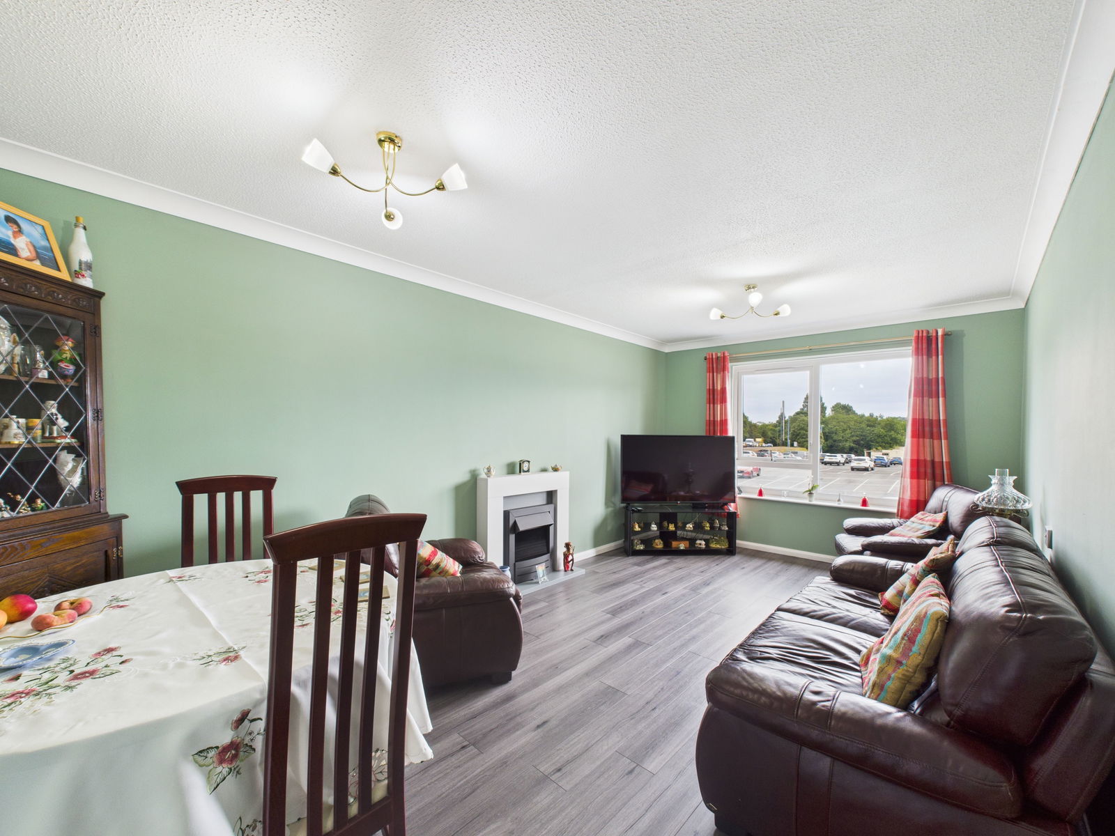 LIVING/DINING ROOM A generously proportioned and light filled living/dining room with a delightful outlook across Clennon Valley. This versatile space offers ample room for furnishings and features a stylish electric fireplace, TV point, uPVC double glazed window and night storage heater.