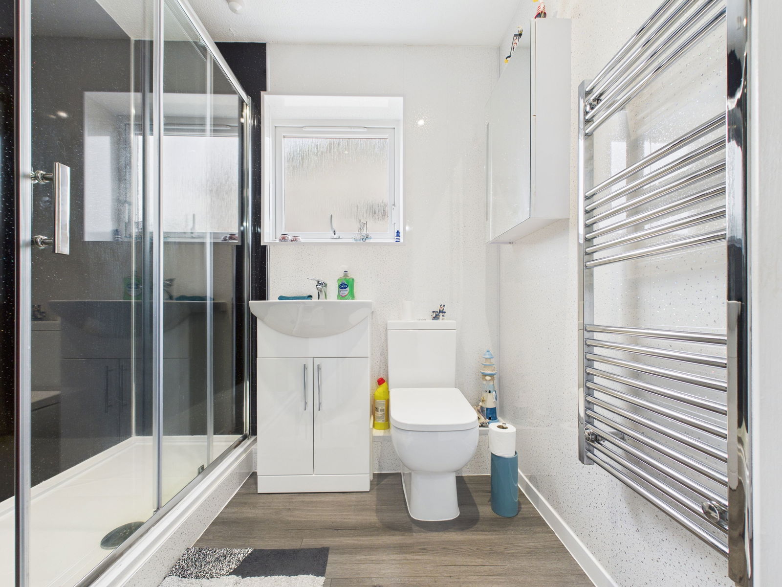 SHOWER ROOM A sleek and contemporary shower room comprising a walk in double shower, low level WC and vanity unit with inset wash basin and storage beneath. Finished with modern wall panelling, a chrome heated towel rail and a uPVC obscure double glazed window.