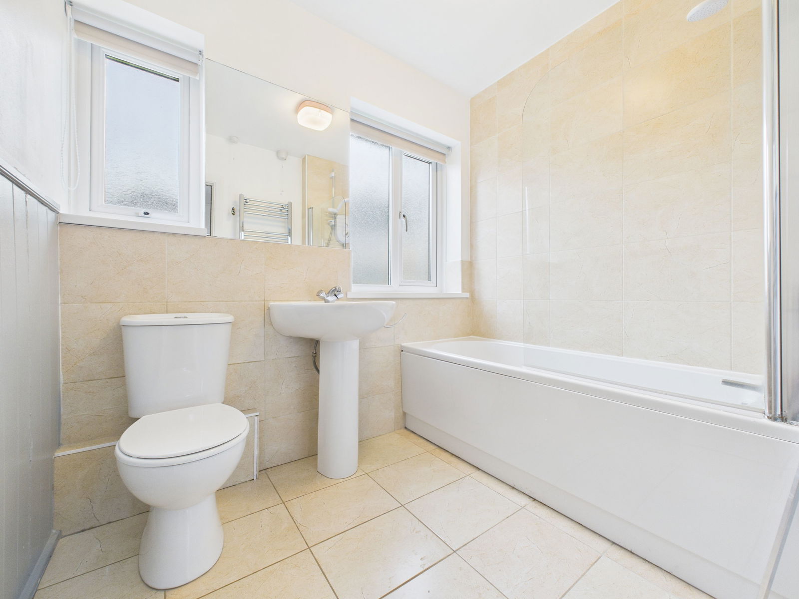BATHROOM White three piece suite comprising panelled bath with electric shower and screen. Pedestal wash basin, low level WC, chrome heated towel rail and uPVC double glazing.