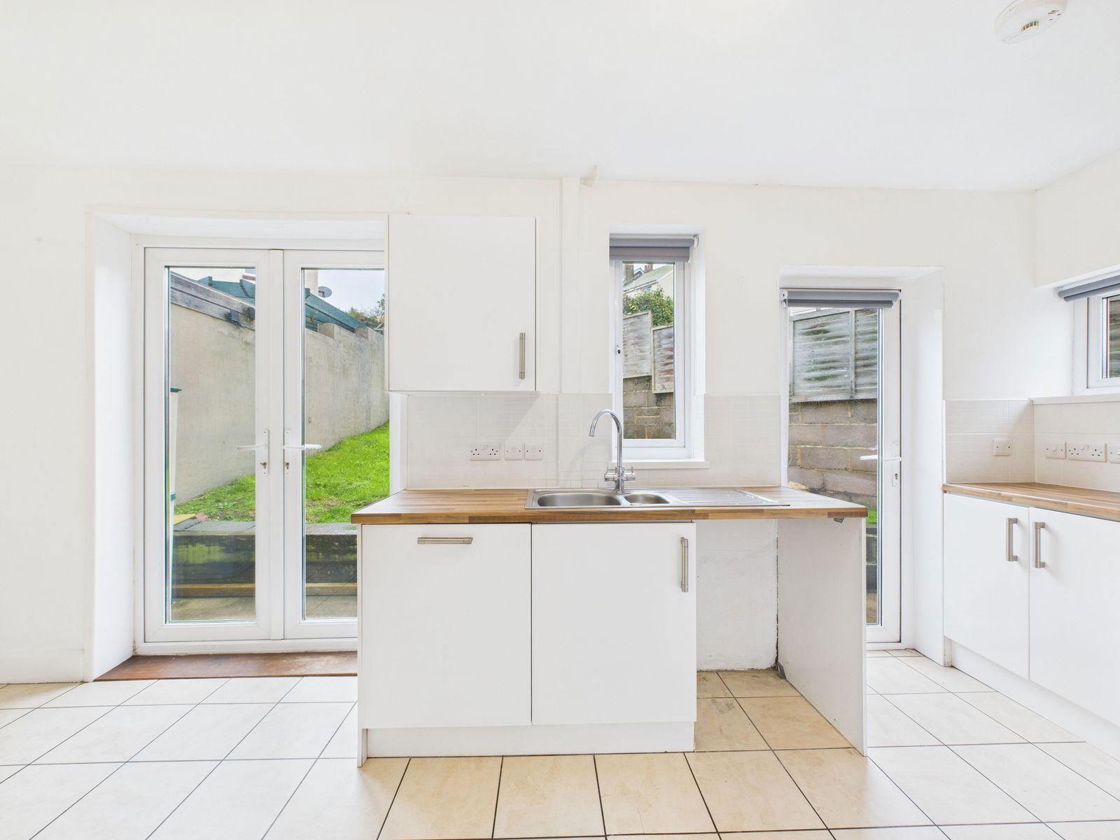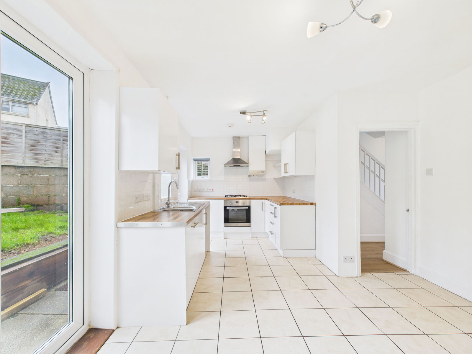 KITCHEN AREA Range of modern high gloss wall units with 1.5 bowl sink and cupboards, drawers and matching wall units above. Gas boiler for central heating and domestic hot water. Inset gas hob and electric oven and extractor hood. Space for Fridge/Freezer and washing machine, concealed dishwasher, tiled floor, uPVC double glazed window and door. French doors to the garden.