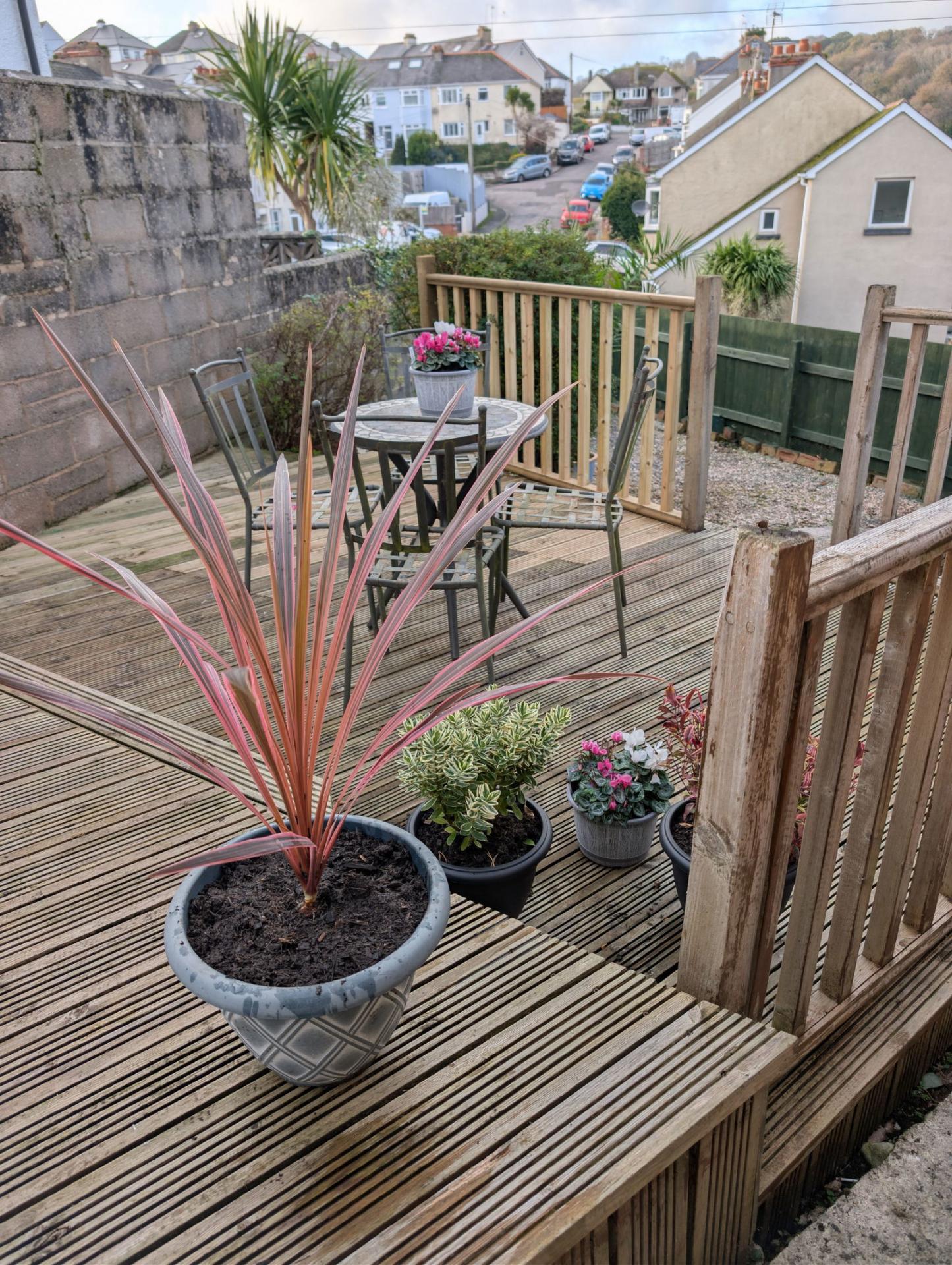 FRONT/SIDE Corner plot front garden laid with chippings and a good sized side patio garden area with decking nicely enclosed with balustrade and with open views.