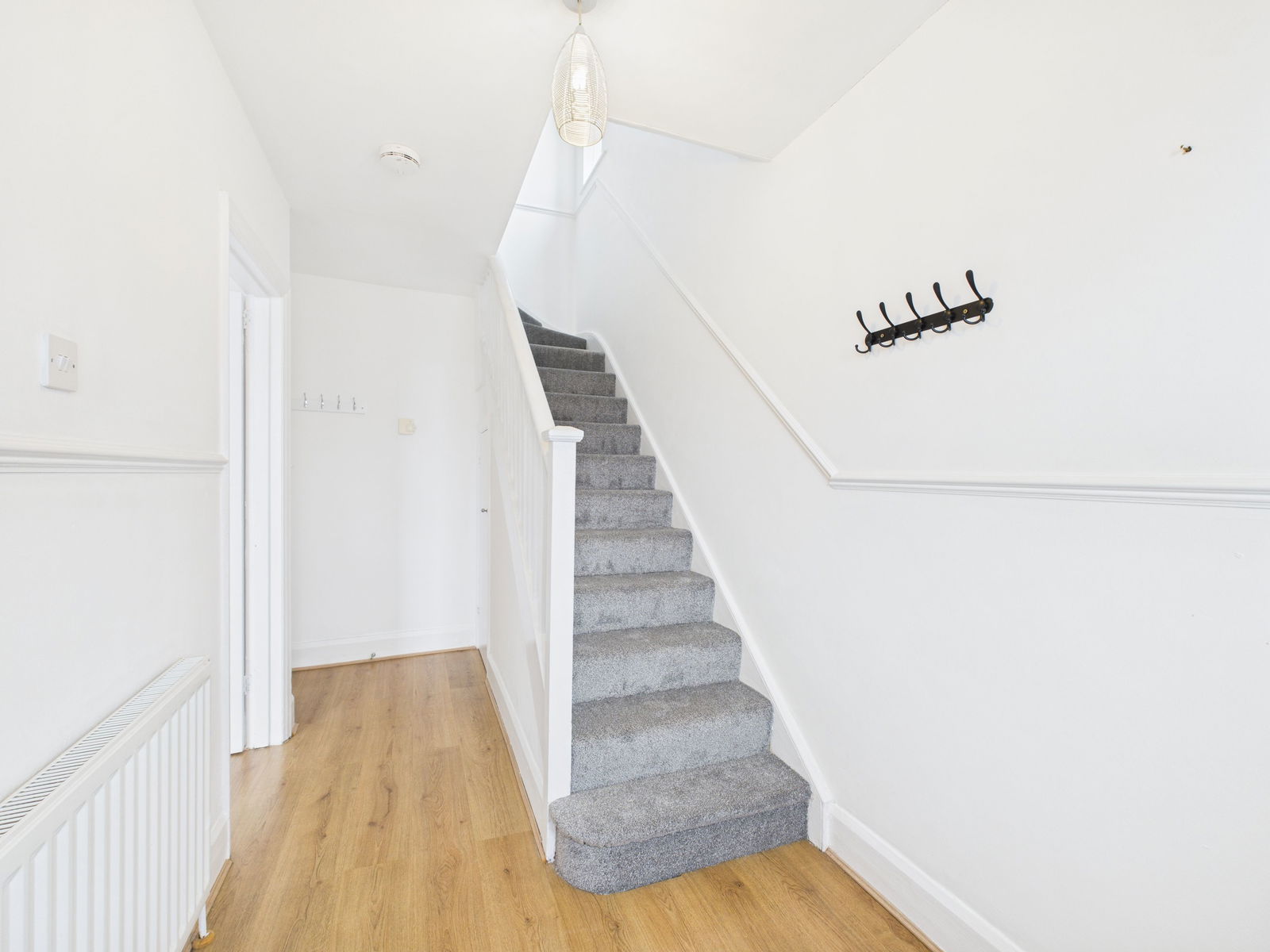 HALLWAY Understairs cupboard. Central heating radiator. Wood effect flooring.
