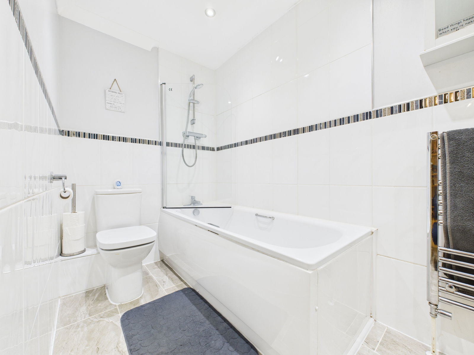 BATHROOM A modern family bathroom comprising a panelled bath with shower attachments above, low level WC, pedestal wash basin, extractor fan, chrome heated towel rail, complementary tiling and a deep built in storage cupboard.