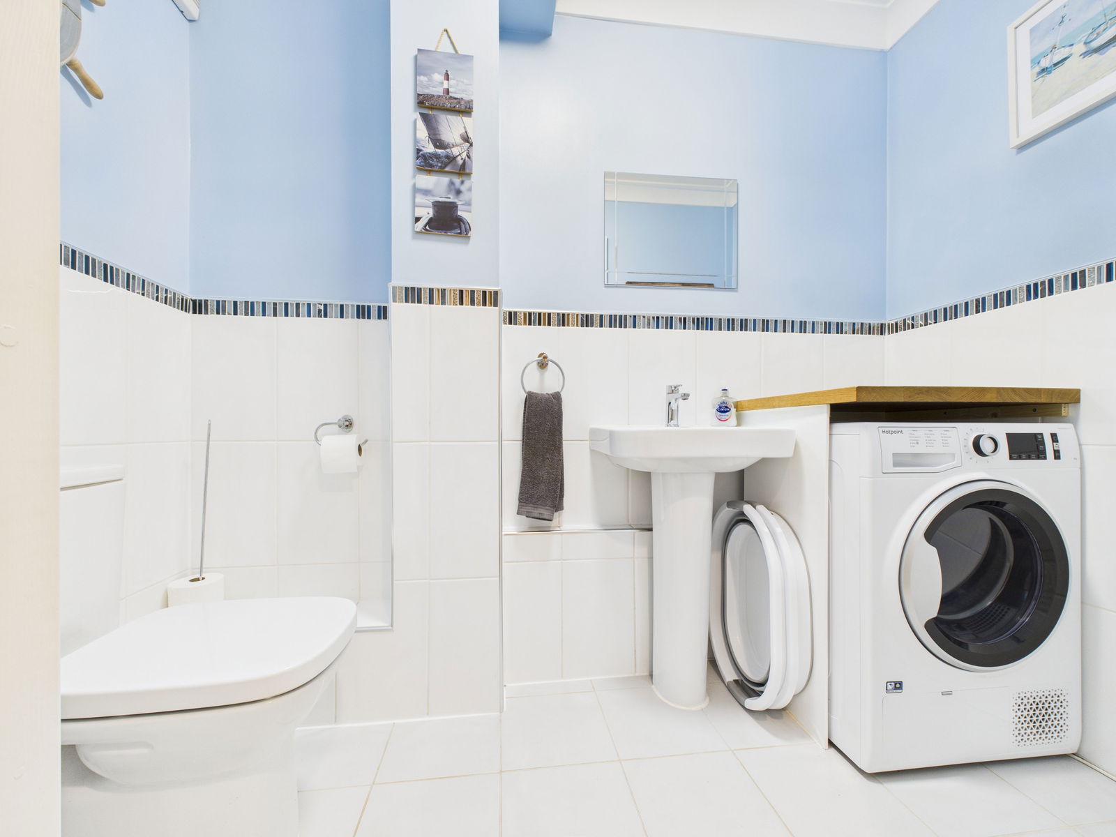 DOWNSTAIRS CLOAKROOM / UTILITY A practical ground floor cloakroom offering a low level WC, pedestal wash basin and space for a dryer. Finished with tiled walls, an extractor fan and a gas central heated radiator.