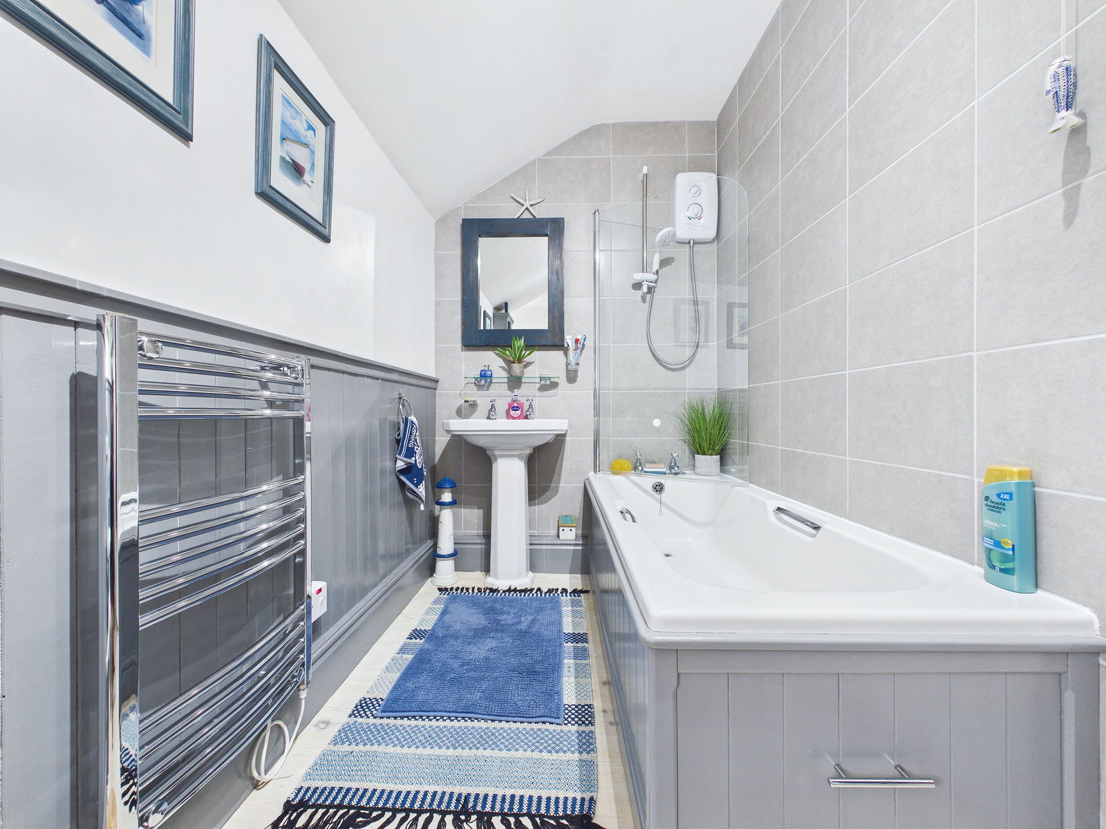 BATHROOM A beautifully presented, nautical inspired bathroom comprising a low level flush WC, pedestal wash hand basin, and panelled bath with shower attachments above and glass shower screen. Finished with panelled walls, an obscure single glazed window, extractor fan, and chrome heated towel rail.