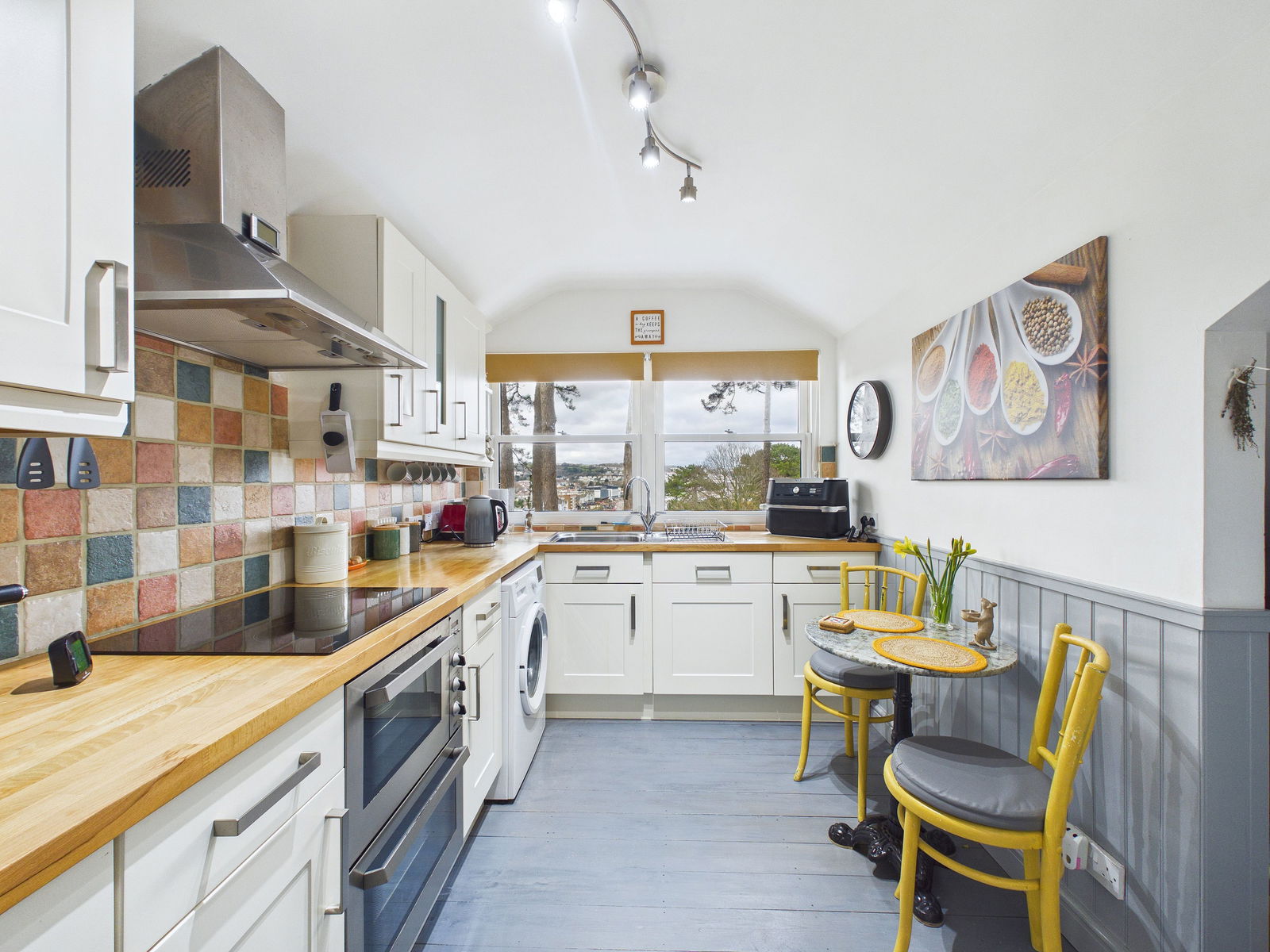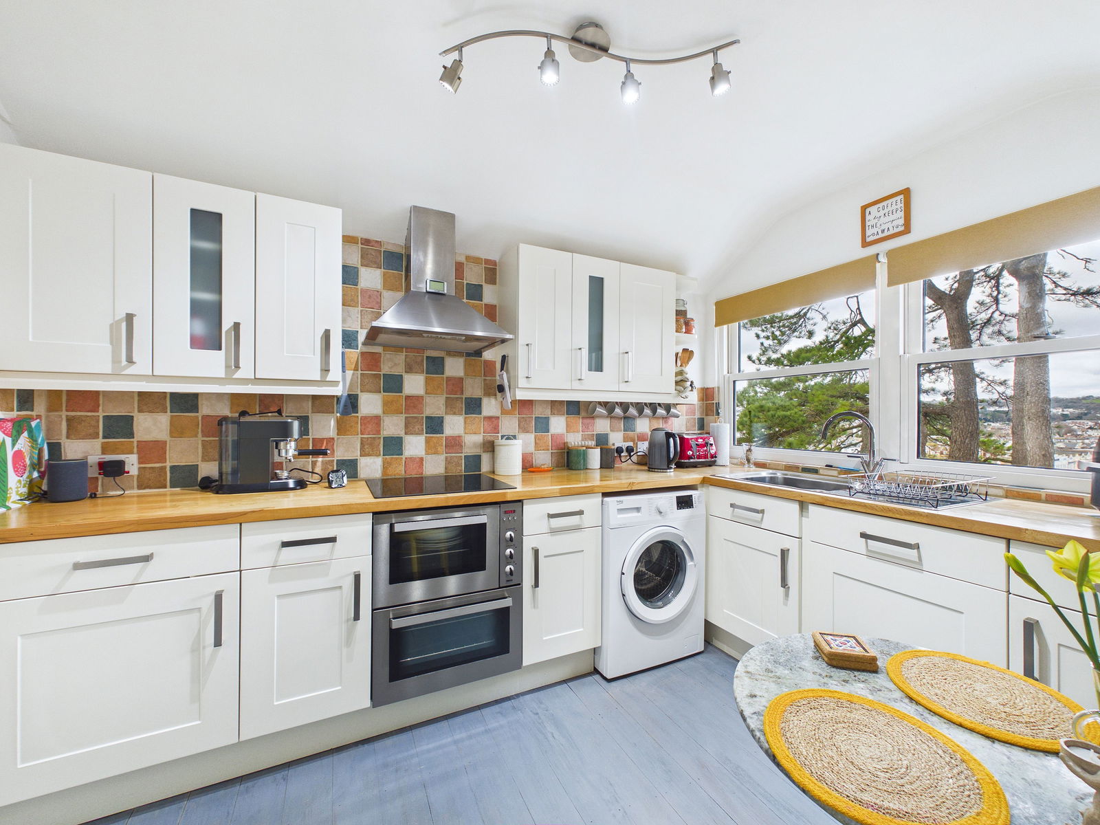 KITCHEN A contemporary fitted kitchen featuring a range of wall, base and drawer units with solid wood surfaces above. The kitchen is equipped with a 1 bowl stainless steel sink and drainer, electric double oven with grill, and a four ring electric hob with extractor hood over. Further benefits include an integral dishwasher, space and plumbing for a washing machine and fridge freezer, tiled splashback, and room for a breakfast table. Double glazed windows provide natural light with sea views over Torbay, while an archway leads to a useful walk in pantry area offering excellent additional storage.