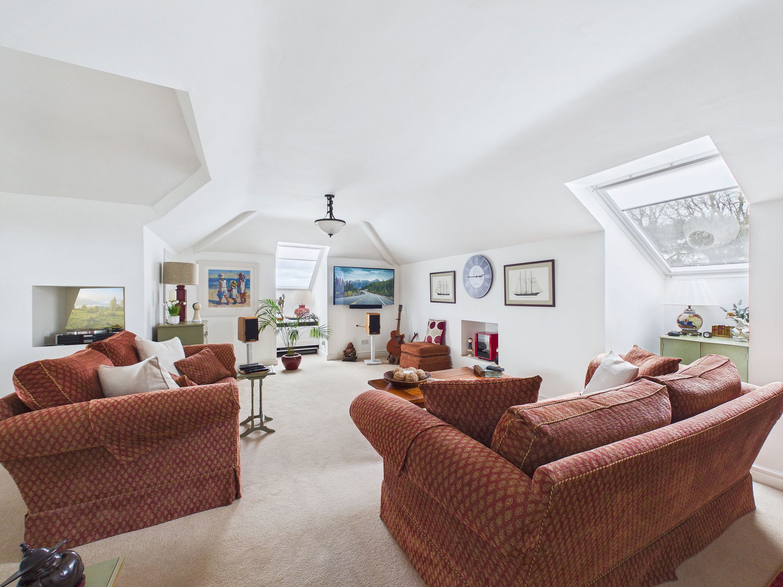 LIVING ROOM / DINING AREA An exceptionally spacious lounge/diner ideal for both relaxing and entertaining, enjoying attractive sea views across to Torquay. The room offers generous space for furnishings, TV and internet points, two large cupboards providing access to loft storage which is currently boarded, double glazed windows, Velux windows capturing the outlook, and two electric storage radiators.
