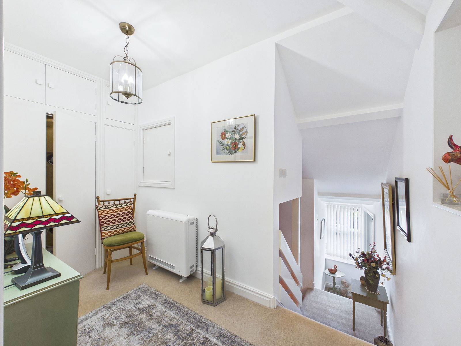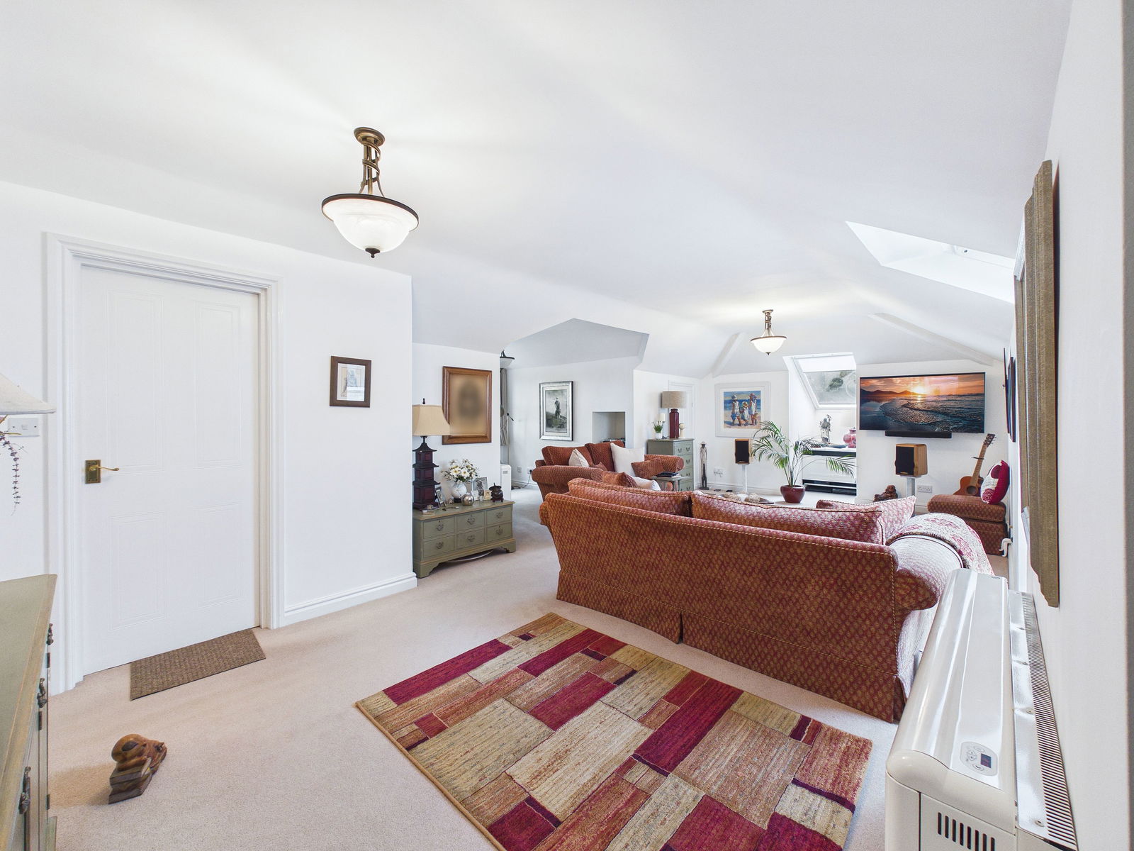 ENTRANCE A fire safety front door opens into a welcoming entranceway with stairs rising to the first floor landing and doors leading to the adjoining rooms. The space is complemented by overhead pendant lighting and an electric storage radiator.