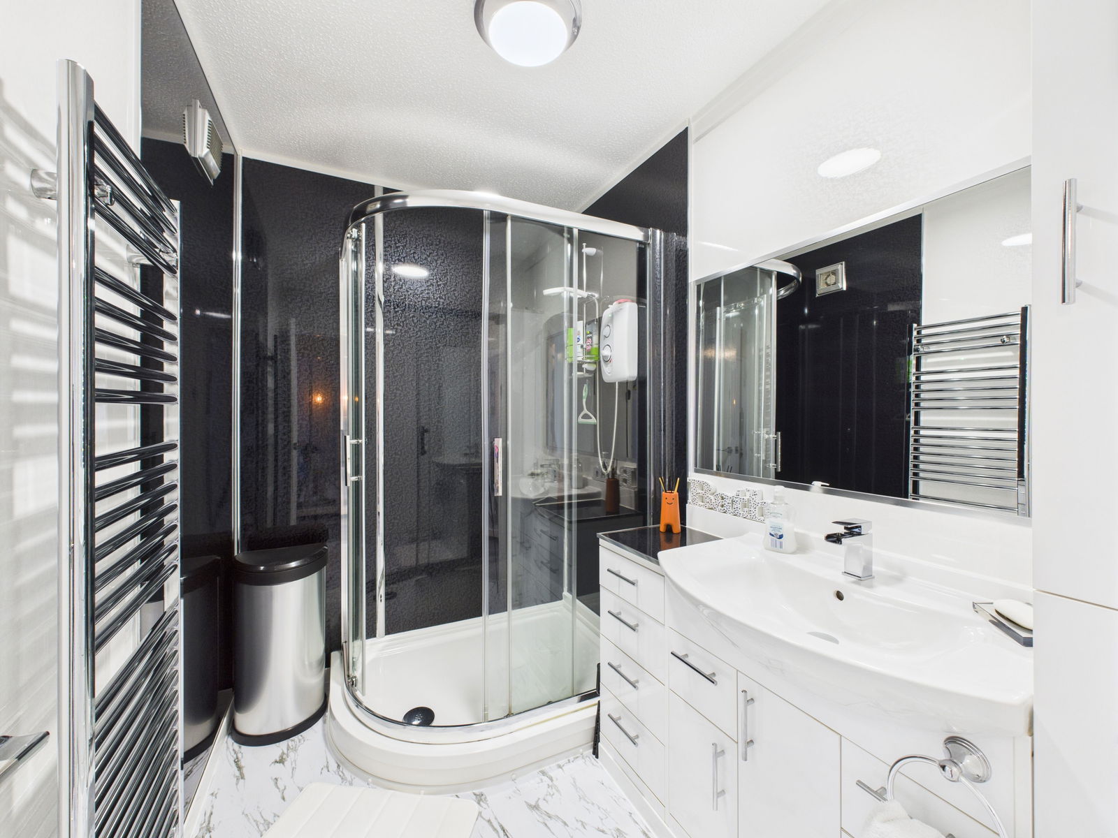 SHOWER ROOM This modern shower room comprises a vanity wash hand basin with built in storage below and a walk in double corner shower unit. Complemented by acrylic wall panelling, a chrome heated towel rail, an extractor fan and a useful fitted storage cupboard.