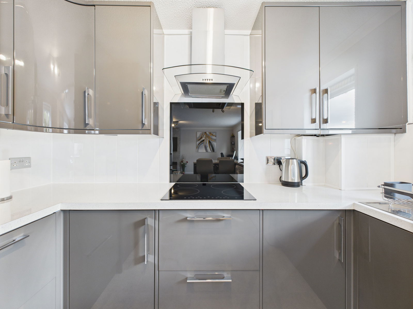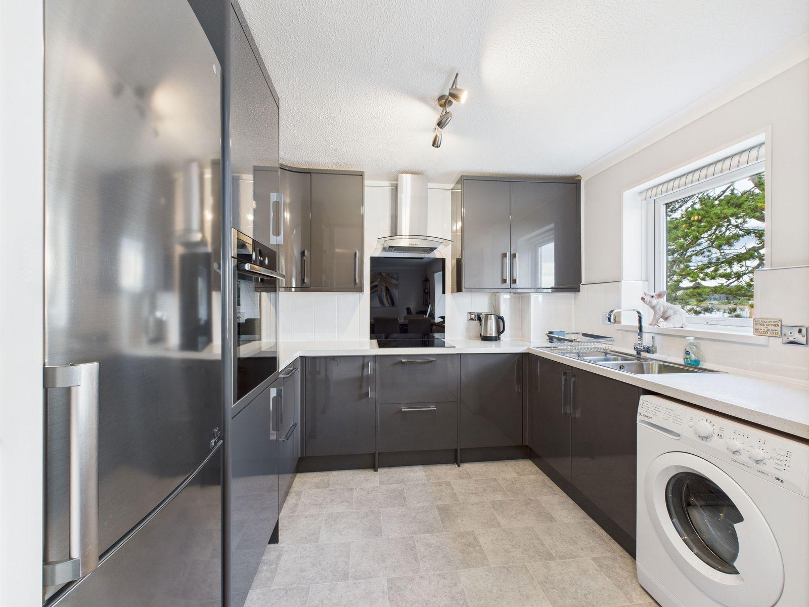 KITCHEN/DINING/LOUNGE Designed for modern living and effortless entertaining, this beautifully appointed open plan space combines the kitchen, dining and lounge areas. The contemporary kitchen showcases high gloss overhead, base and drawer units complemented by square edged work surfaces. Features include a 1 1/2 bowl stainless steel sink and drainer, a built in eye level Neff electric oven with integrated grill, a four ring induction hob with extractor hood and designated space and plumbing for a washing machine, dryer and fridge freezer. The kitchen also features stylish tile backsplash, breakfast bar seating and a uPVC double glazed window capturing the wonderful sea views.