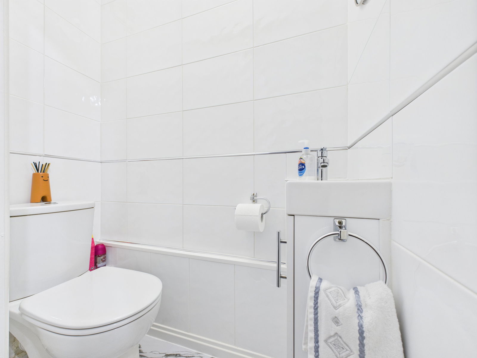 CLOAKROOM A convenient separate cloakroom featuring a low level flush WC, a wall mounted wash hand basin with integrated storage below, part tiled walls and an extractor fan.