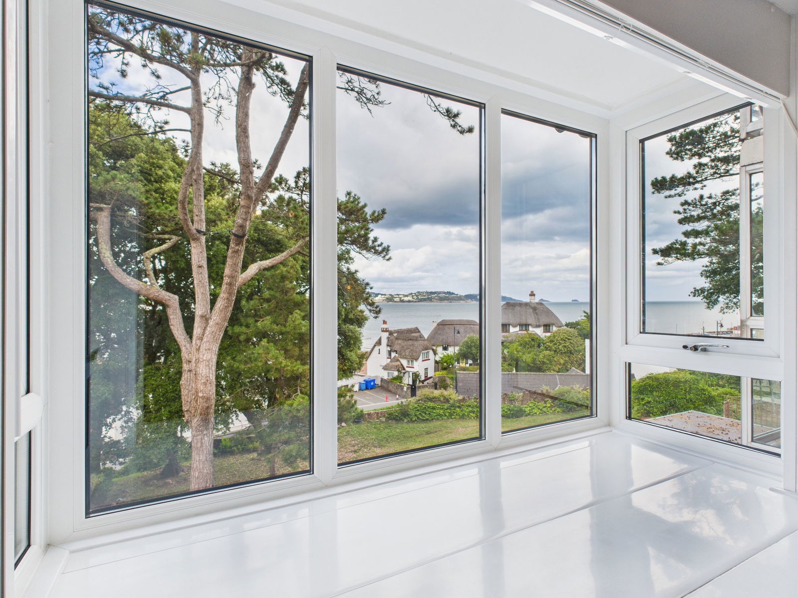 The generous lounge area comfortably accommodates a variety of furnishings and includes a contemporary media wall electric fireplace, TV and internet points, a uPVC double glazed bay window with stunning sea views across the bay and a gas central heated radiator.