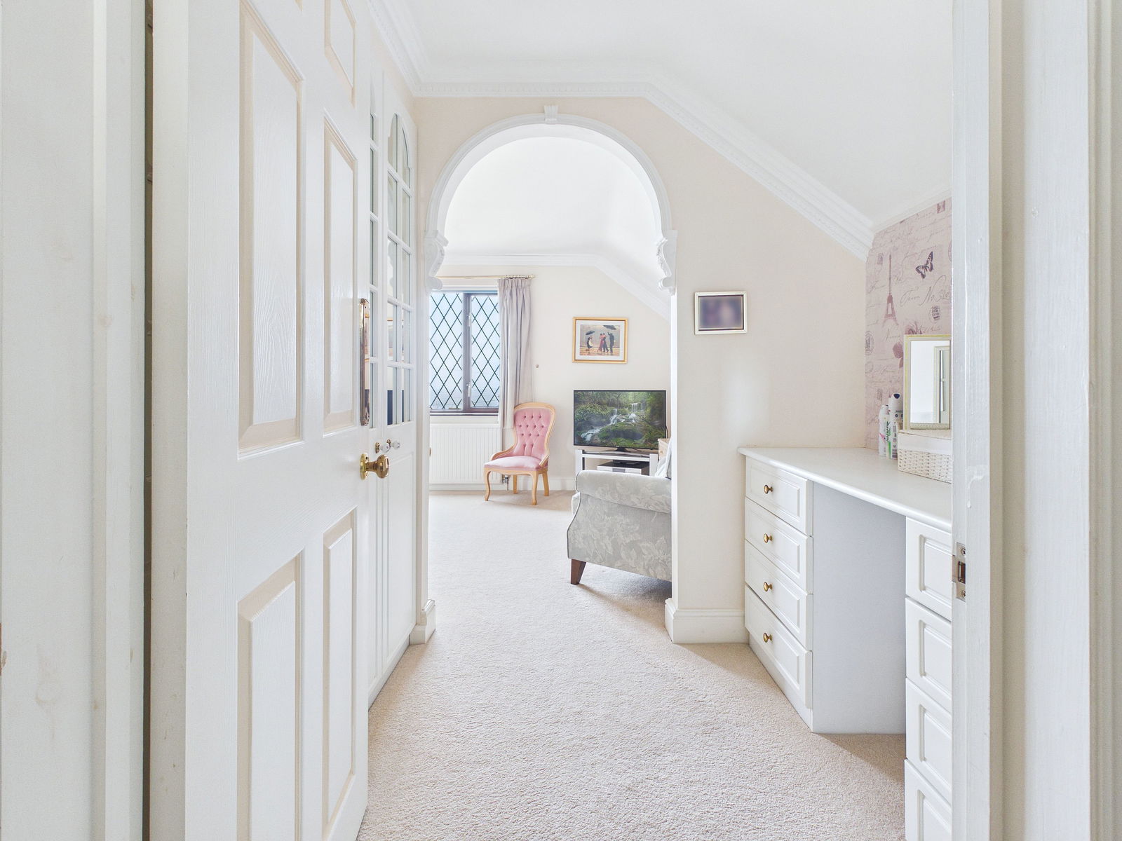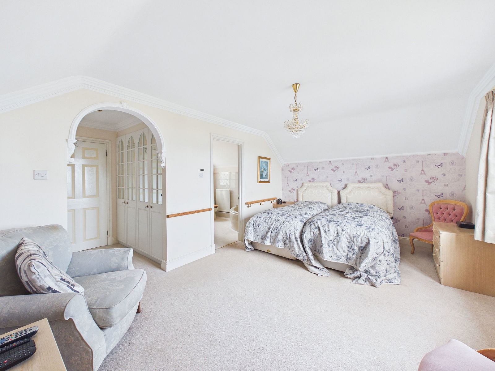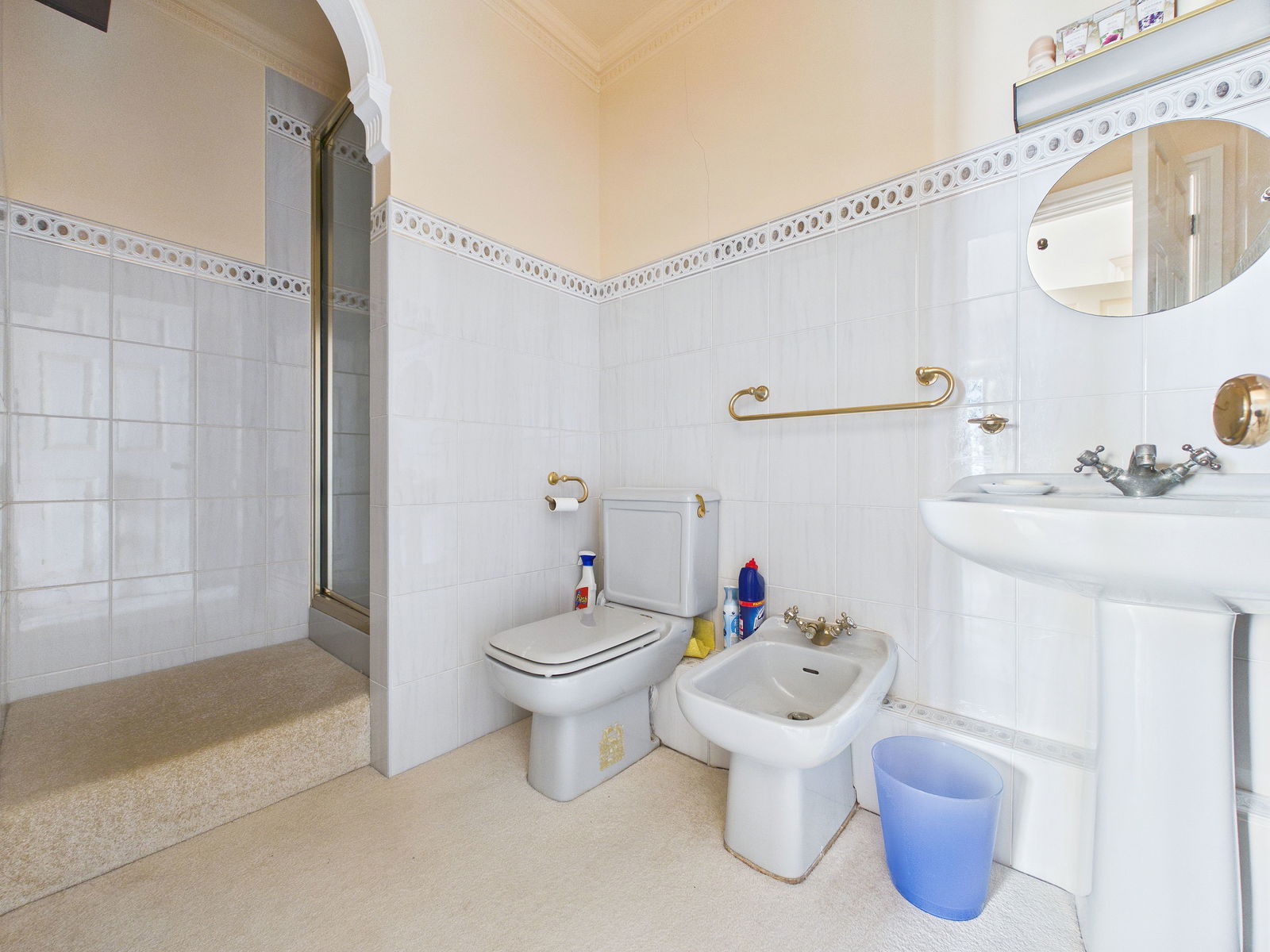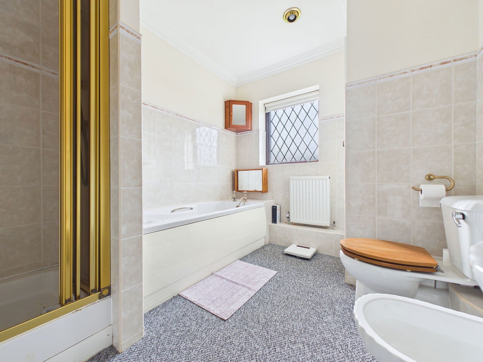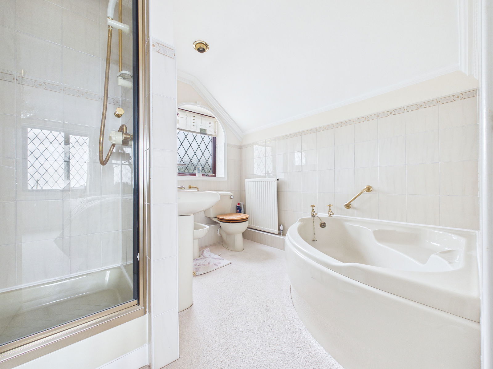 EN-SUITE A spacious en-suite featuring low level WC, pedestal wash hand basin, bidet, corner bath, and separate shower cubicle. Finished with tiled walls, obscure uPVC double glazed window, mirrored medicine cabinet and gas central heating radiator.