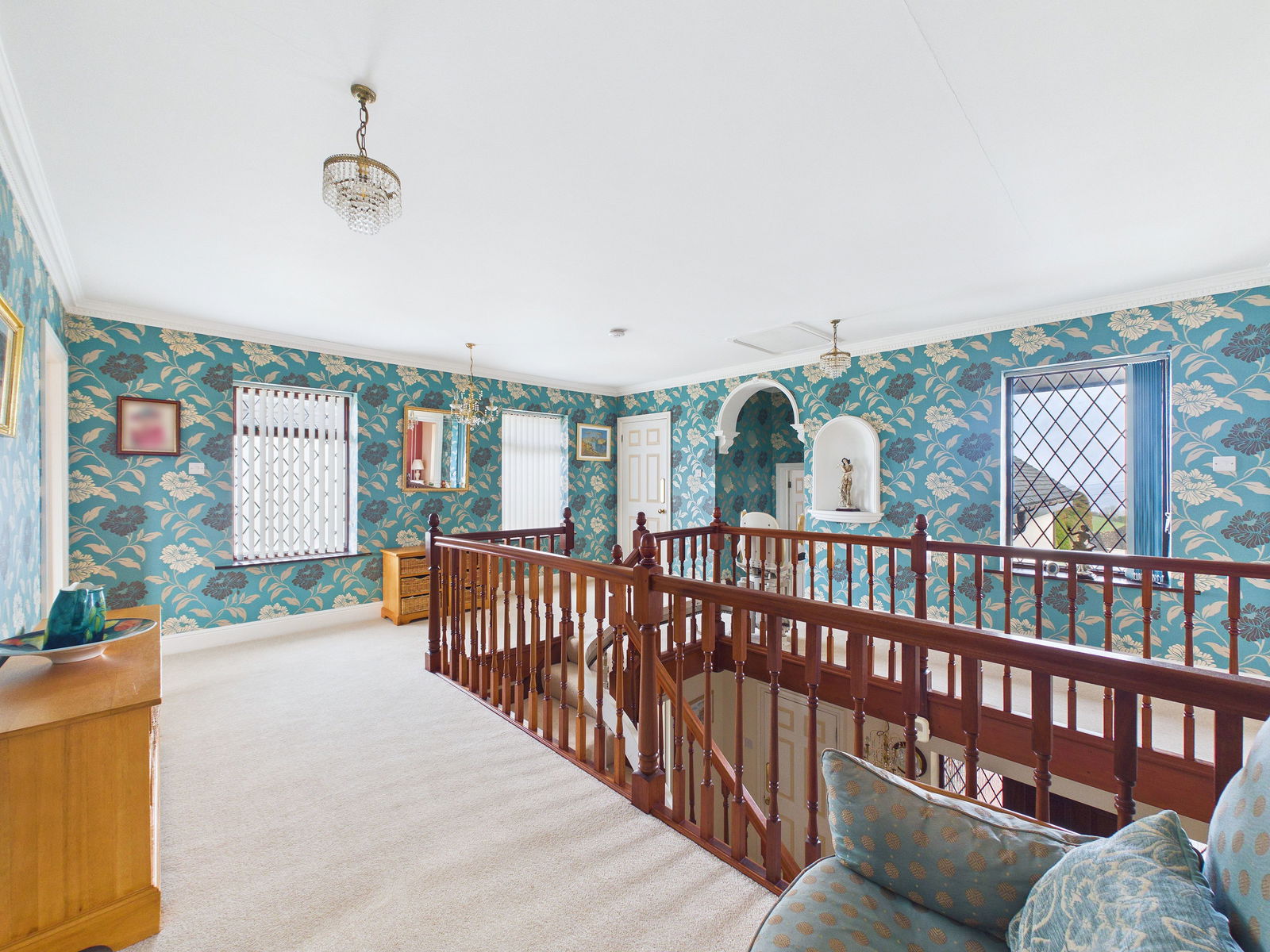 LANDING A large and impressive landing with doors to all rooms, dual aspect uPVC double glazing, pendant lighting, and a fitted airing cupboard.